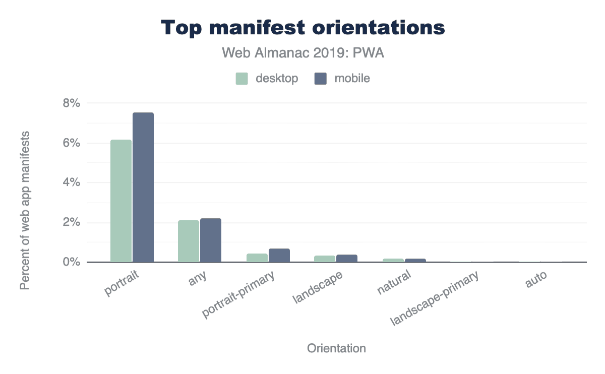 このプロパティを利用したマニフェストはあまり多くありませんでしたが、モバイルで最も人気のあるカテゴリである「ショッピング」から「ビジネス」「テクノロジー」、そして最初の場所を均等に共有するデスクトップ上の「ウェブ」(それが意味するものは何でも)。