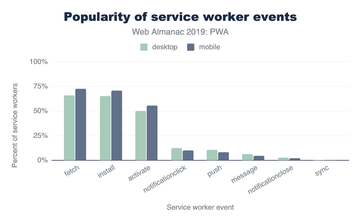 HTTP Archiveで見つけることのできるService Workerがこれらのイベントのどれをリッスンしているかを調べました。モバイルとデスクトップの結果は非常によく似ており、fetch、install、およびactivateが3つの最も人気のあるイベントであり、それに続いてnotificationclickとpushが行われます。これらの結果を解釈すると、Service Workerが有効にするオフラインユースケースは、プッシュ通知よりもはるかに先のアプリ開発者にとって最も魅力的な機能です。可用性が限られているため、あまり一般的ではないユースケースのため、現時点ではバックグラウンド同期は重要な役割を果たしていません。