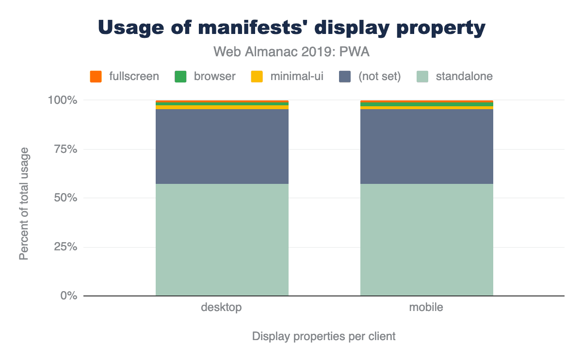 standaloneを選択することで、エンドユーザーにブラウザUIが表示されないようにします。これは、prefers_related_applicationsプロパティを使用するアプリの大部分に反映されています。モバイルアプリケーションとデスクトップアプリケーションの両方の97%がネイティブアプリケーションを優先していません。