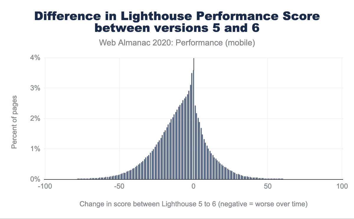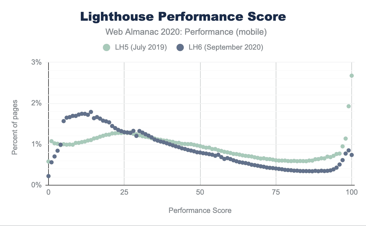 Lighthouse 5とLighthouse 6の比較では、スコアの分布がどのように変化したかを直接観察できます。Lighthouse 6のアルゴリズムでは、0~25点のスコアを獲得したページの割合が増え、50~100点のスコアを獲得したページの割合が減っています。Lighthouse 5では、100点を獲得したページの割合は3%でしたが、Lighthouse 6では、その割合はわずか1%にまで減少しました。