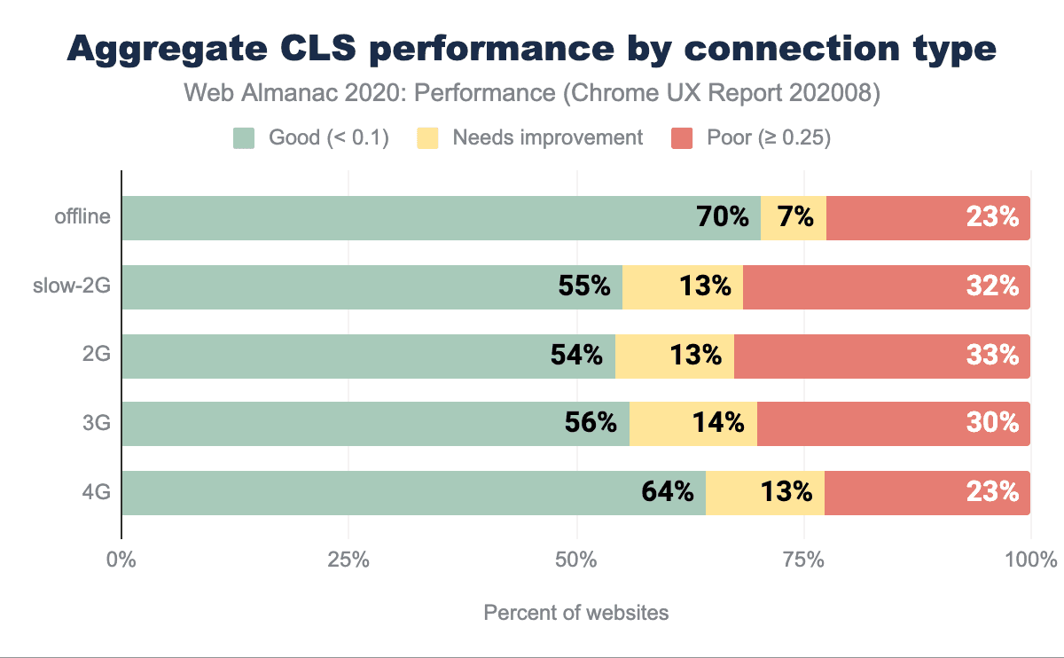 視覚的安定性は、LCPのような他のメトリクスに対する地理的および遅延の影響を受けにくい。上位の国と下位の国との間の良い評価の割合の差は、LCPでは61%、CLSではわずか13%です。中程度の評価のウェブサイトの割合は全体的に比較的低く、全体的に悪い体験の割合は19%~29%となっています。CLSの低下には多くの要因があります。Optimize Cumulative Layout Shift guideでは、それらの要因に対処する方法を紹介しています。