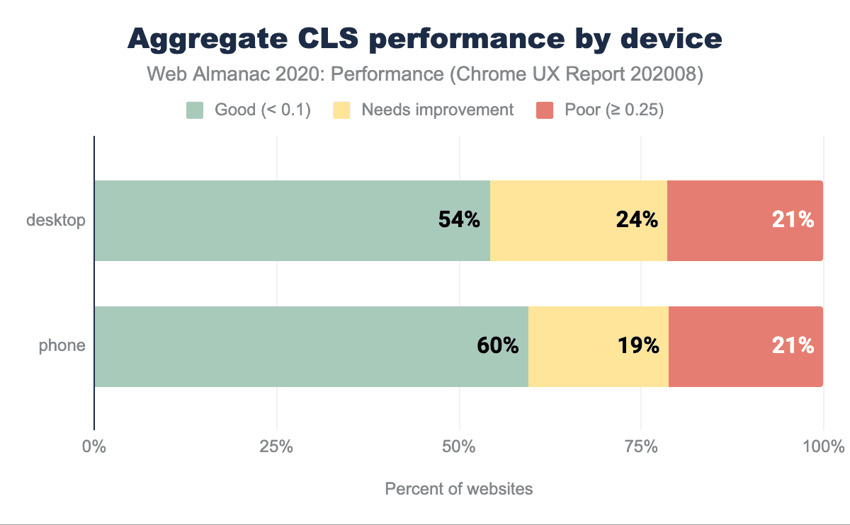 CrUXのデータによると、デスクトップの場合もモバイルの場合も、半数以上のWebサイトがCLSの良い評価を得ています。デスクトップとモバイルでは、評価の高いウェブサイトの数にわずかな差(6ポイント)があり、モバイルの方が有利です。これは、モバイルに最適化されているため、機能やビジュアルが充実していない傾向があり、CLS評価では携帯電話がリードしていると推測できます。