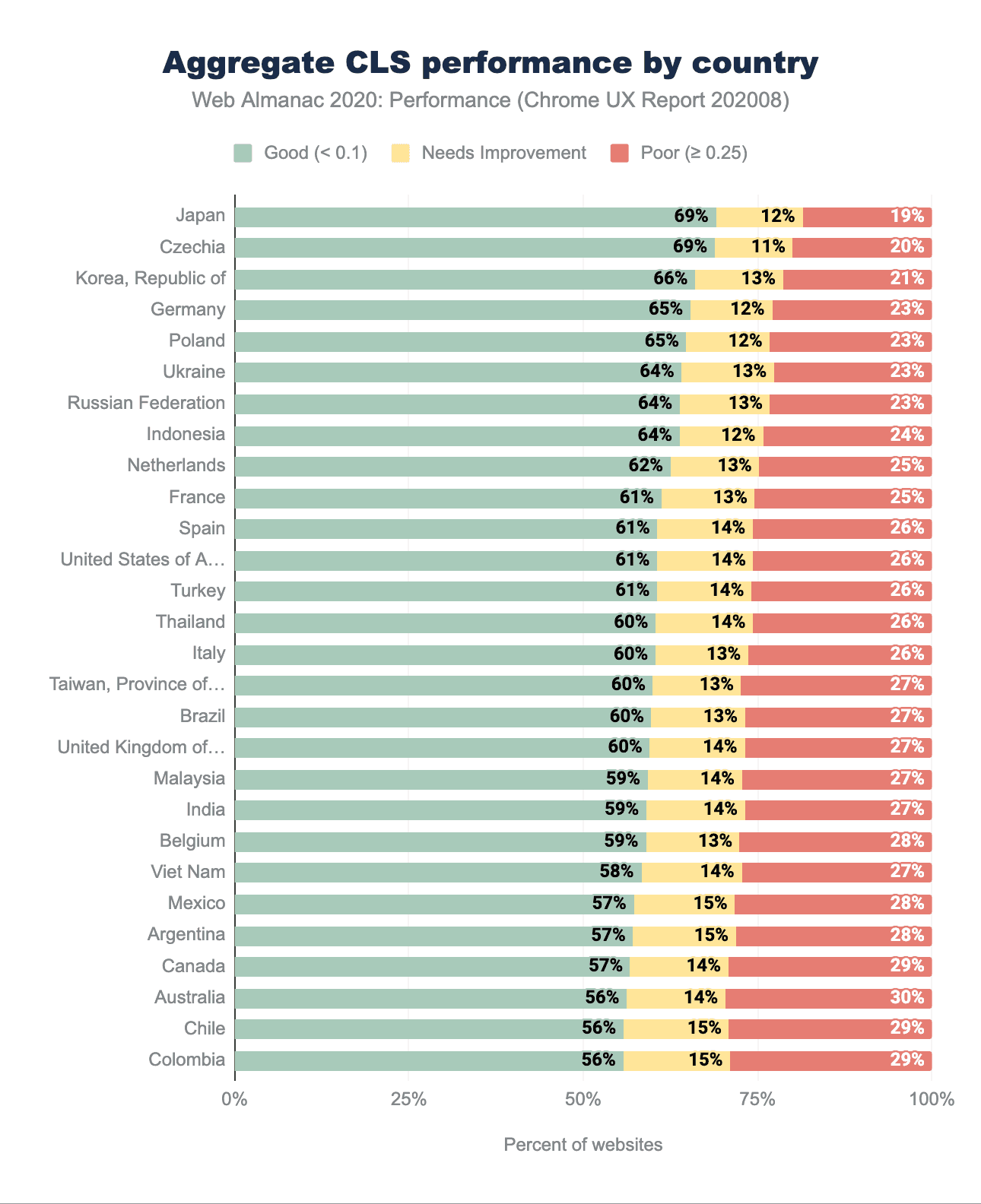 異なる地域でのCLSのパフォーマンスは主に良好で、少なくとも56%のサイトが「良好」と評価されました。これは、視覚的に安定していると思われる優れたニュースです。LCPの地域分布で見られたように、韓国、日本、チェコ、ドイツ、ポーランドといった国が上位を占めていることがわかります。