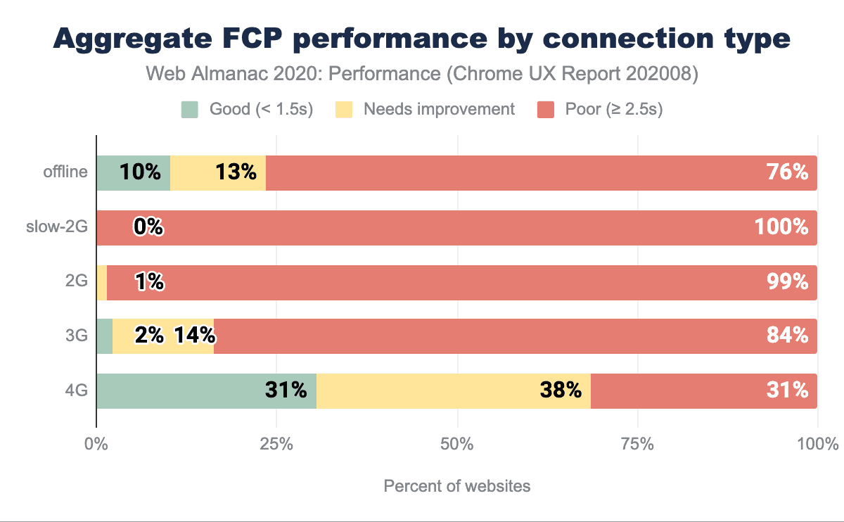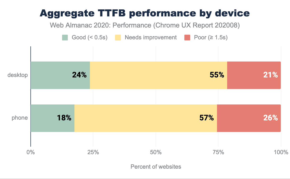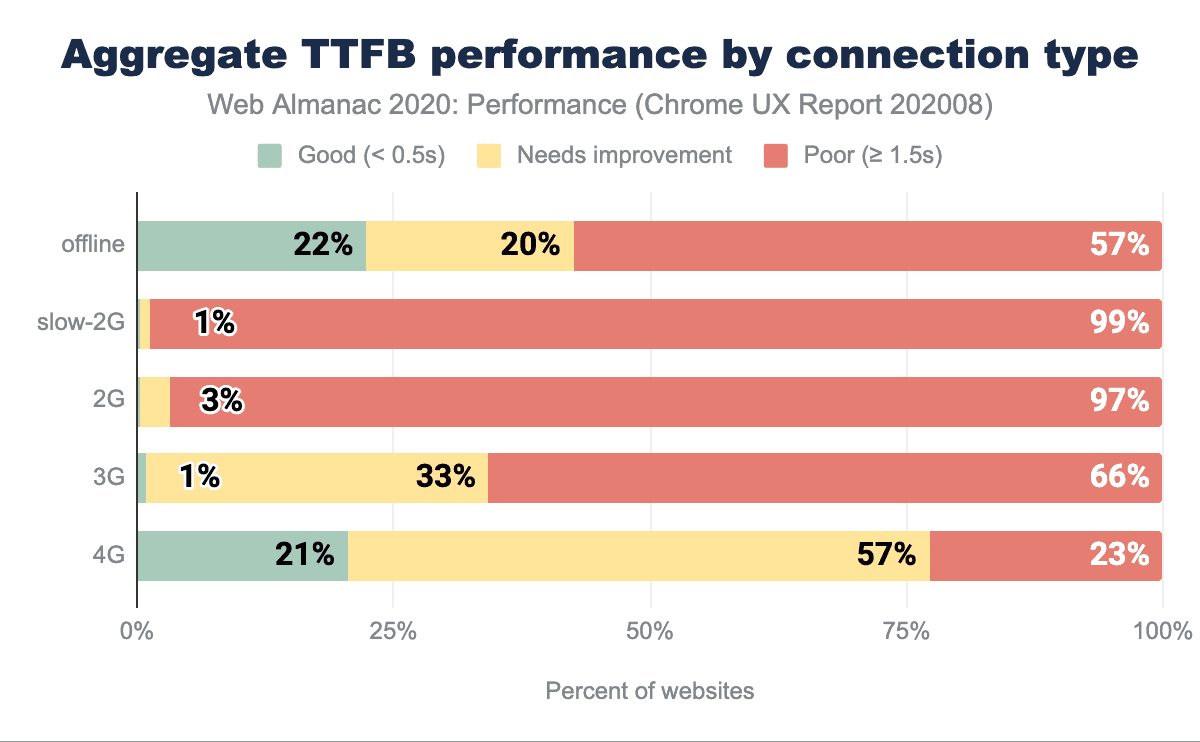 TTFBは、ネットワークのレイテンシーと接続タイプの影響を受けます。遅延が大きいほど、また接続速度が遅いほど、TTFBの測定値は悪くなります(上図参照)。高速とされるモバイル接続(4G)でも、TTFBが高速なWebサイトはわずか21%です。4Gの速度以下で速いと分類されたサイトはほとんどありません。