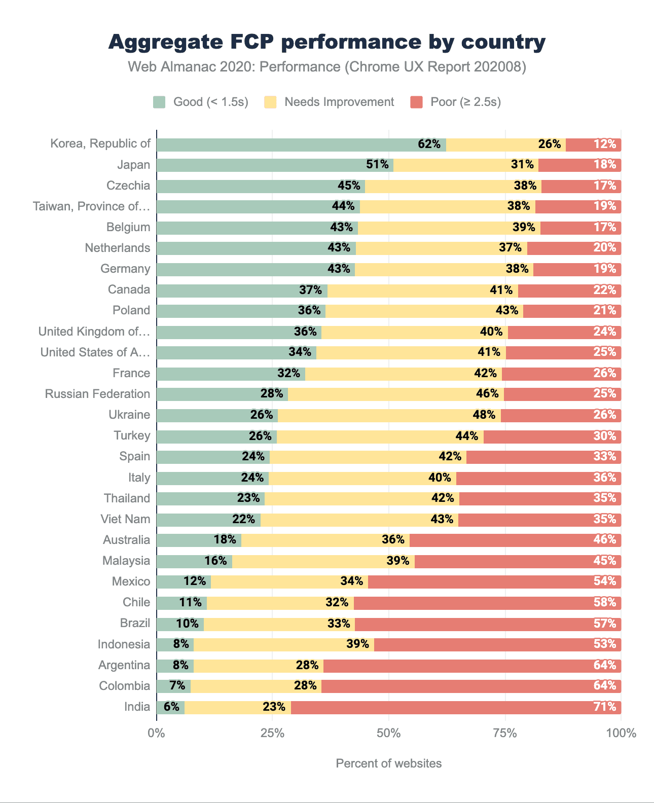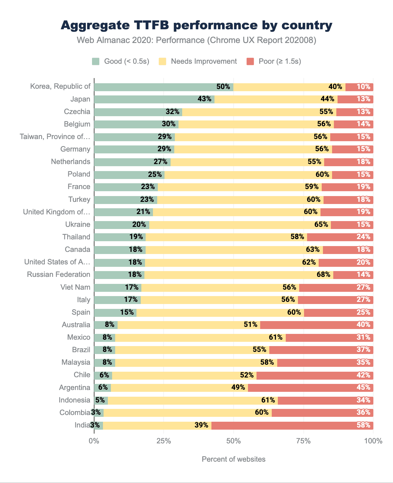 この変化は、分布がより多くの「良い」および「悪い」評価のウェブサイトにシフトすることを意味します。昨年の結果と比較しても、「良い」ウェブサイトと「悪い」ウェブサイトの割合が上昇していることから、その傾向を観察できます。速いウェブサイトの割合が高い上位10地域は、チェコとベルギーが加わり、米国と英国が落ちたことで、2019年とは比較的変わりません。韓国は、高速FCPを報告しているウェブサイトの62%でトップに立ち、昨年から約2倍になっています(これも、結果の再分類によるものと思われます)。ランキング上位の他の国でも、良い体験をしたという報告が倍増しています。