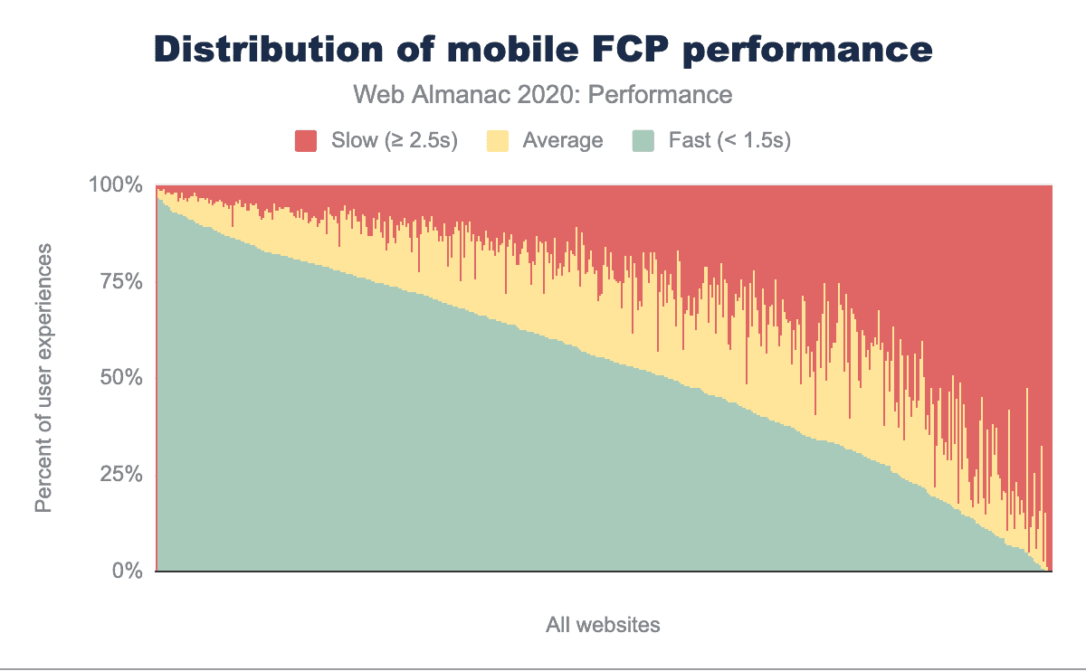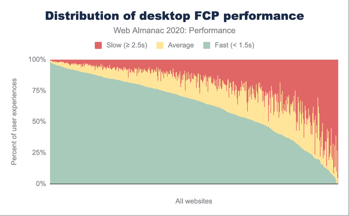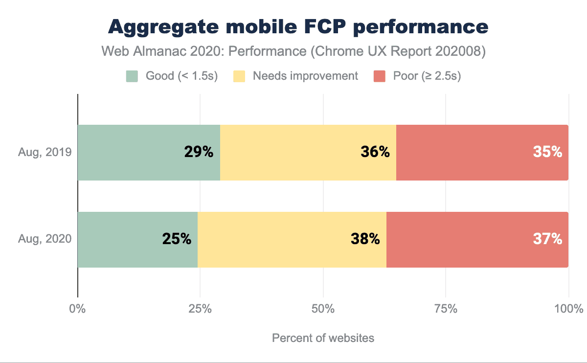 分析を掘り下げる前に、2019年の「パフォーマンス」の章では、「良い」と「悪い」の分類のしきい値が2020年とは異なっていたことに触れておきます。2019年には、FCPが1秒以下のサイトは「良い」とされ、FCPが3秒以上のサイトは「悪い」に分類されました。2020年には、これらの範囲は「良い」が1.5秒、「悪い」が2.5秒にシフトしました。