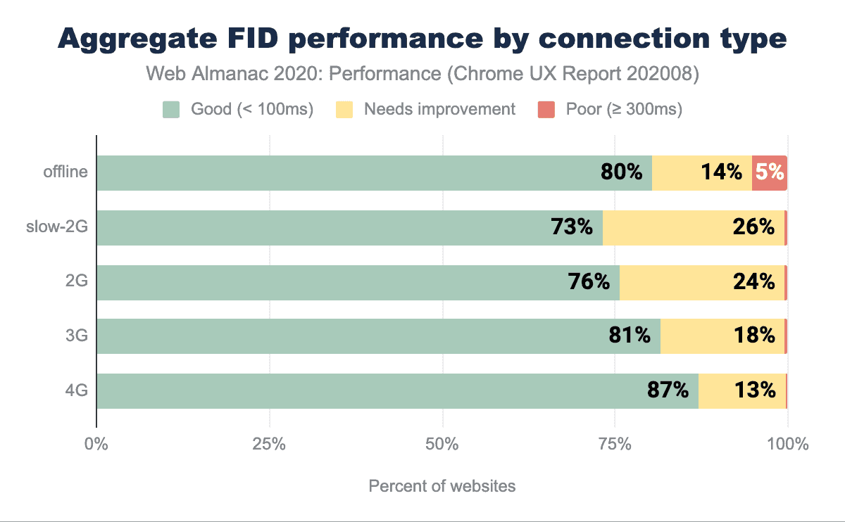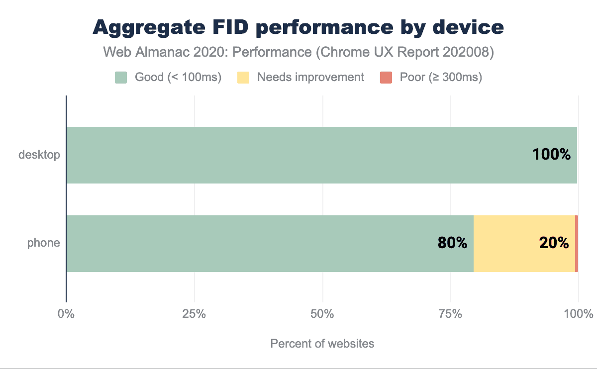 モバイルでは、80%のサイトが「良い」と評価されています。これは、デスクトップに比べてCPUの能力が低いこと、モバイルでのネットワークの遅延(スクリプトのダウンロードと実行が遅れる)、さらにバッテリー効率と温度の制限によりモバイル機器のCPUの能力が制限されていることが原因と考えられます。これらはすべて、FIDなどのインタラクティビティ指標に直接影響します。
