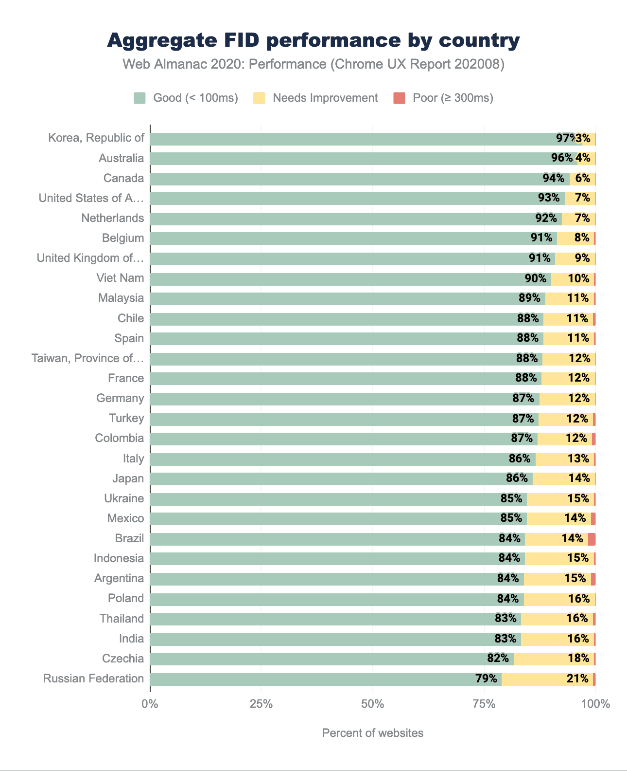 FIDスコアの地理的分布は、先に紹介したデバイス集計表の結果を裏付けるものです。最悪の場合、79%のWebサイトが良好なFIDを持っていますが、トップは97%と印象的で、韓国が再びリードしています。興味深いことに、CLSとLCPのランキングで上位を占めていたチェコ、ポーランド、ウクライナ、ロシアなどの国々が、このランキングでは最下位になっています。