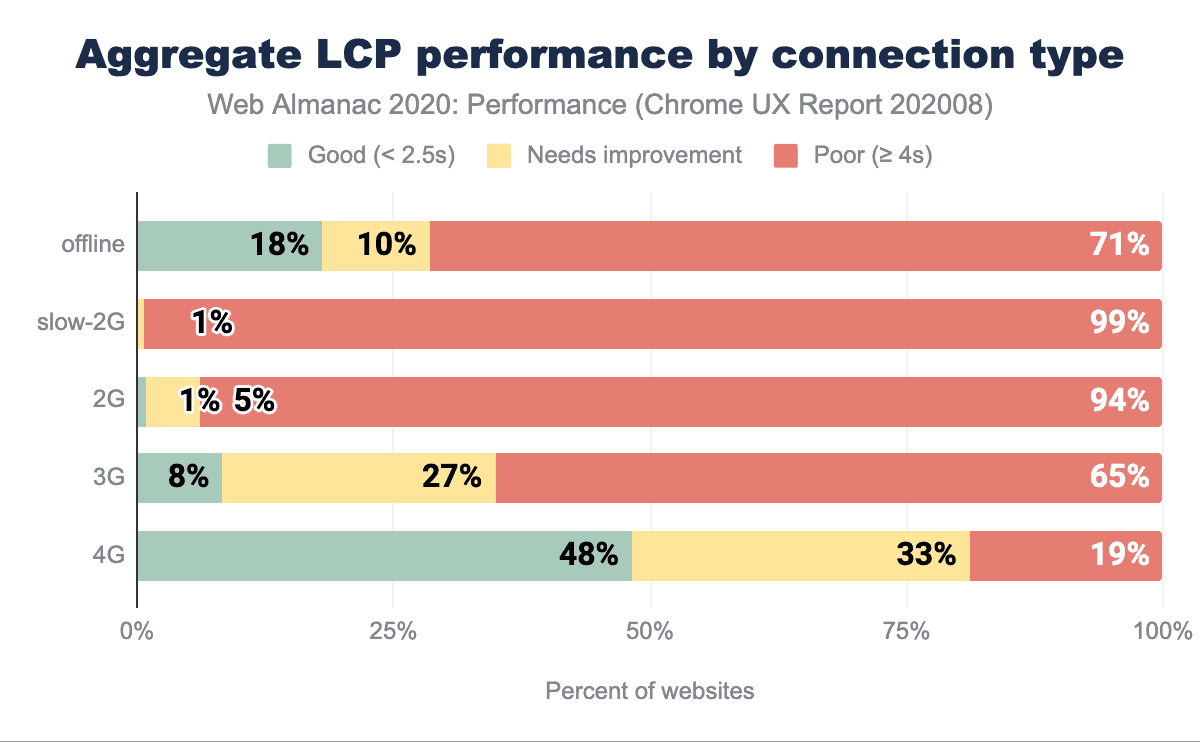 ネットワーク速度とLCPパフォーマンスの向上には明確な相関関係がありますが、4Gであっても、結果が「良好」に分類されたのは48% に過ぎず、読み取り値の半分は改善が必要とされています。メディアの最適化を自動化し、適切なサイズとフォーマットを提供し、さらに低データモードに最適化することで、針を動かすことができるでしょう。このガイドでは、LCPの最適化について詳しく説明しています。