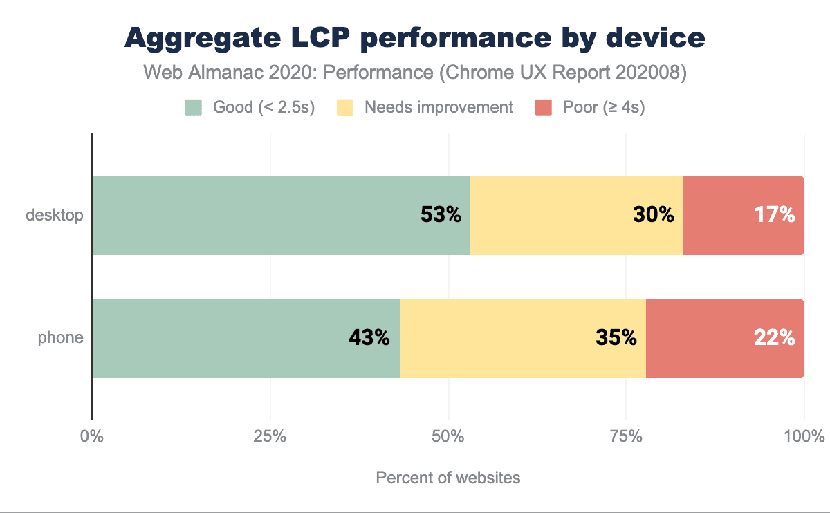 上のグラフでは、43%から53%のウェブサイトでLCPのパフォーマンスが、良好(2.5秒以下)であることがわかります。つまり、大多数のウェブサイトでは、重要なオーバーザフォールドメディアを優先的に高速で読み込むことができています。比較的新しい指標としては、これは楽観的なシグナルと言えます。デスクトップとモバイルで若干の差があるのは、ネットワークの速度、デバイスの性能、画像のサイズ(デスクトップ特有の大きな画像は、ダウンロードとレンダリングに多くの時間を使う)が、異なることが原因と考えられます。