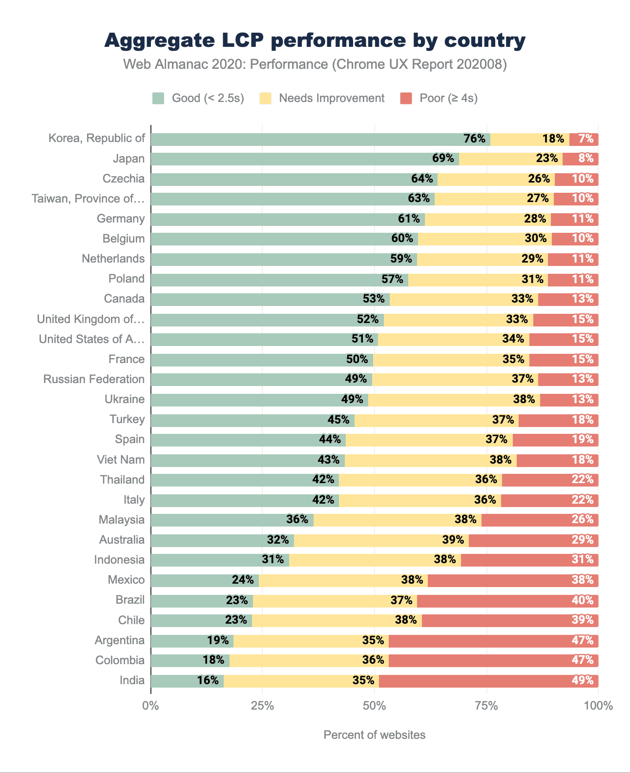 良好なLCP測定値の割合がもっとも高いのは、主にヨーロッパとアジアの国々に分布しており、韓国は良好な測定値の割合が76%でトップでした。韓国は携帯電話の通信速度において常にトップであり、10月にはダウンロード145Mbpsという驚異的な数値が Speedtest Global Index で報告されています。日本、チェコ、台湾、ドイツ、ベルギーも、確実に高いモバイル速度を誇る国の一角です。オーストラリアは、モバイルネットワークの速度ではトップであるものの、デスクトップ接続の遅さと遅延に悩まされており、上記のランキングでは最下位となっています。