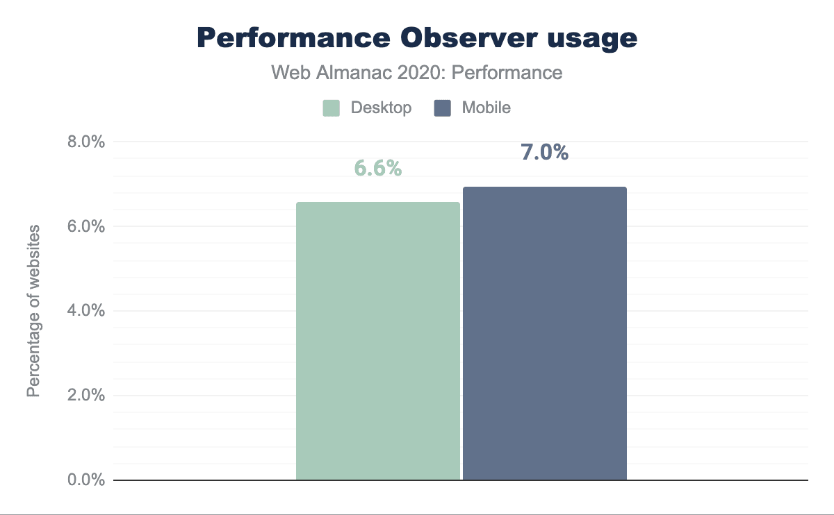 上の図では、Performance Observerは、デバイスタイプに応じて追跡サイトの6~7%で使用されていることを示しています。これらのWebサイトは、低レベルAPIを活用してカスタムメトリクスを作成し、PerformanceObserver APIでそれらを照合して、他のパフォーマンスレポートツールで使用する可能性があります。このような採用率は、定義済みのメトリクスに傾倒する傾向を示しているかもしれませんが(たとえば、Lighthouseから来ている)、比較的ニッチなAPIとしては印象的でもあります。