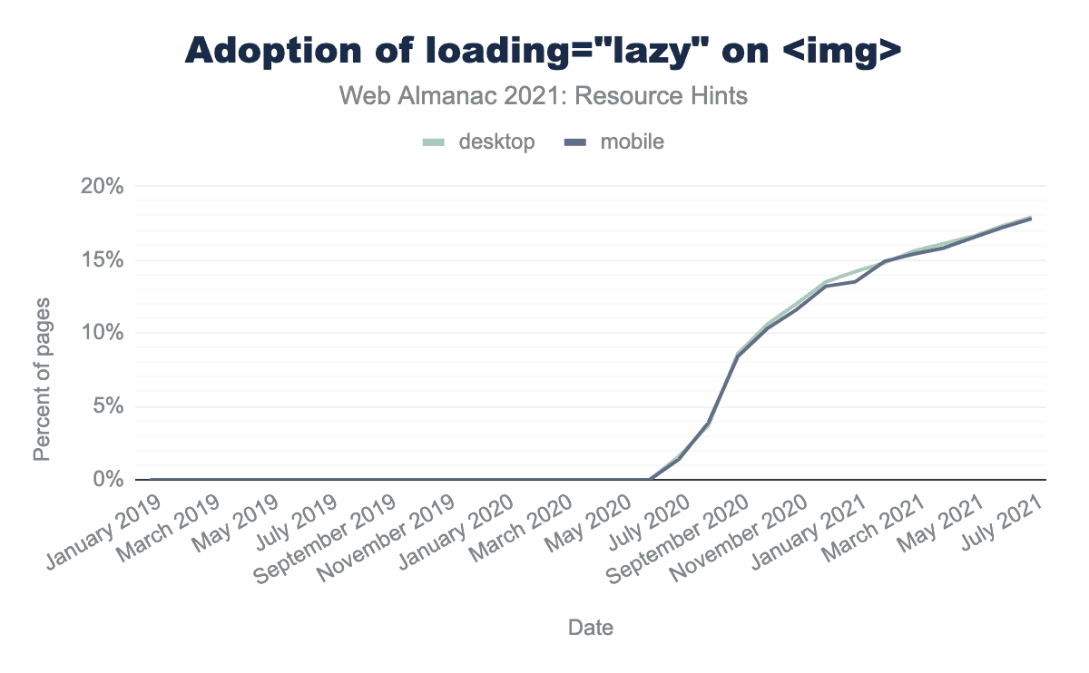 2020年7月、ネイティブ遅延読み込みはわずか1%のページで使用されていました。2021年7月には、その数は18%にまで爆発的に増えています。これは、毎年更新されない膨大な数のページやテンプレートを考えると、信じられないような伸び率です。