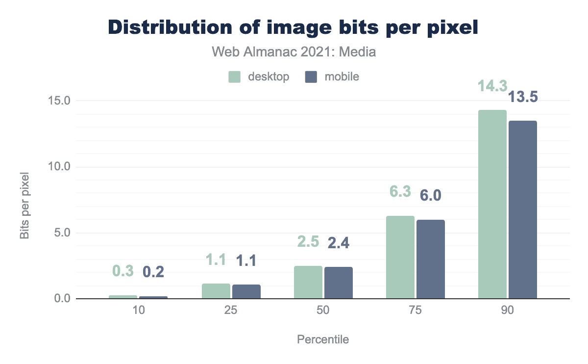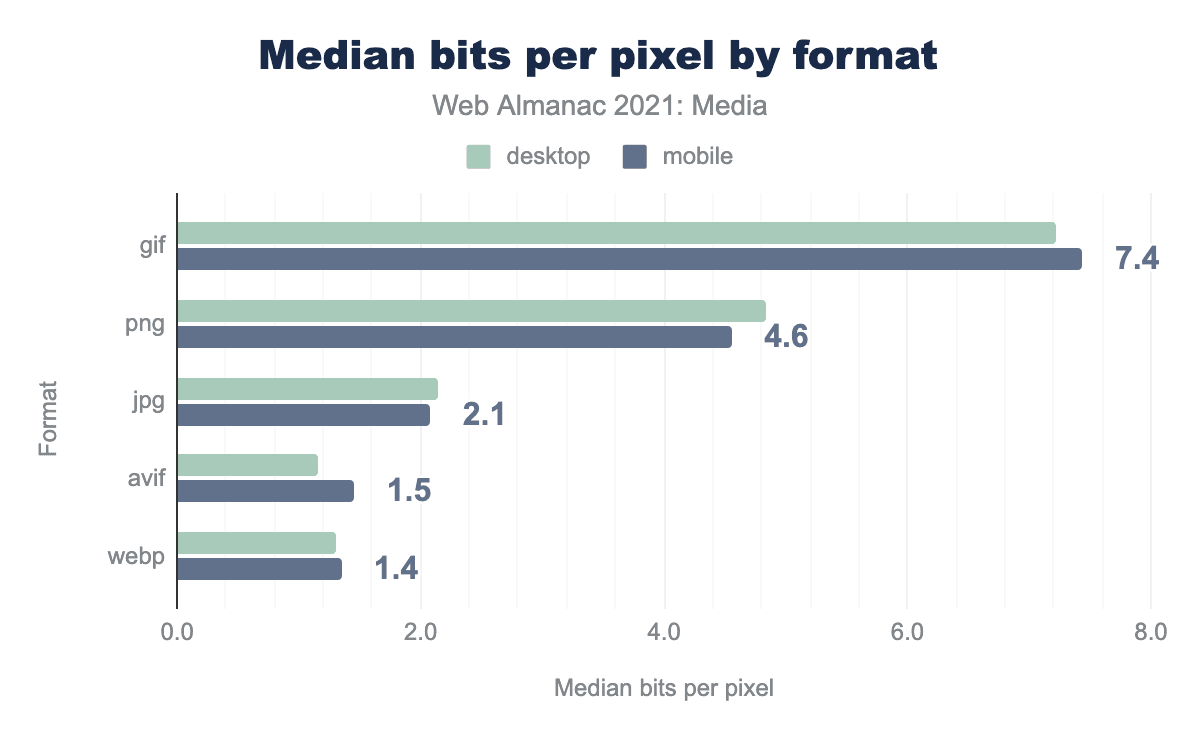 gifはデスクトップ用7.2、モバイル用7.4、pngはそれぞれ4.8、4.6、jpgは2.1、1.5、avifは1.3、1.4、webpは1.3と1.4です。JPEGの中央値は、1ピクセルあたり2.1ビットです。このフォーマットはどこにでもあるため、他のフォーマットを測定するための最適な基準値となります。