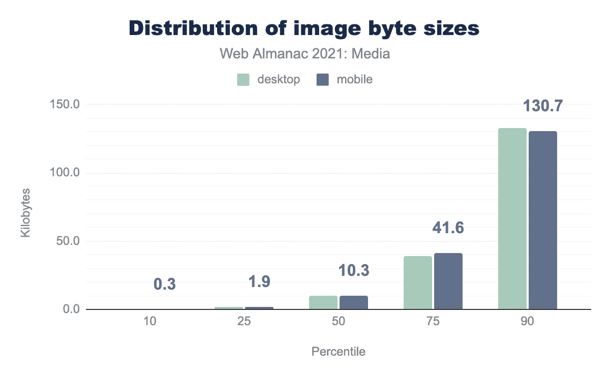 コンテンツが多い<img>の中央値は、10kB強です。しかし、中央のページには15個以上の <img> が含まれているため、ページ全体の全画像の90パーセンタイルを見ると、100kBを超える画像はまったく珍しくありません。