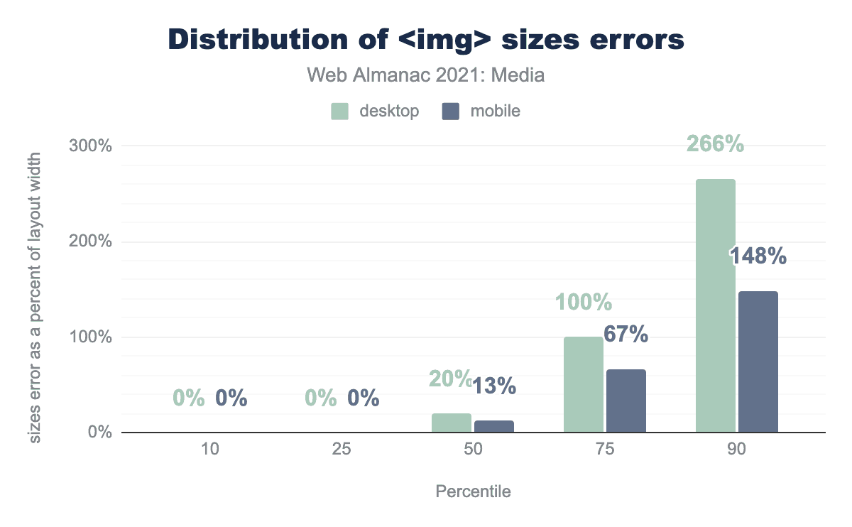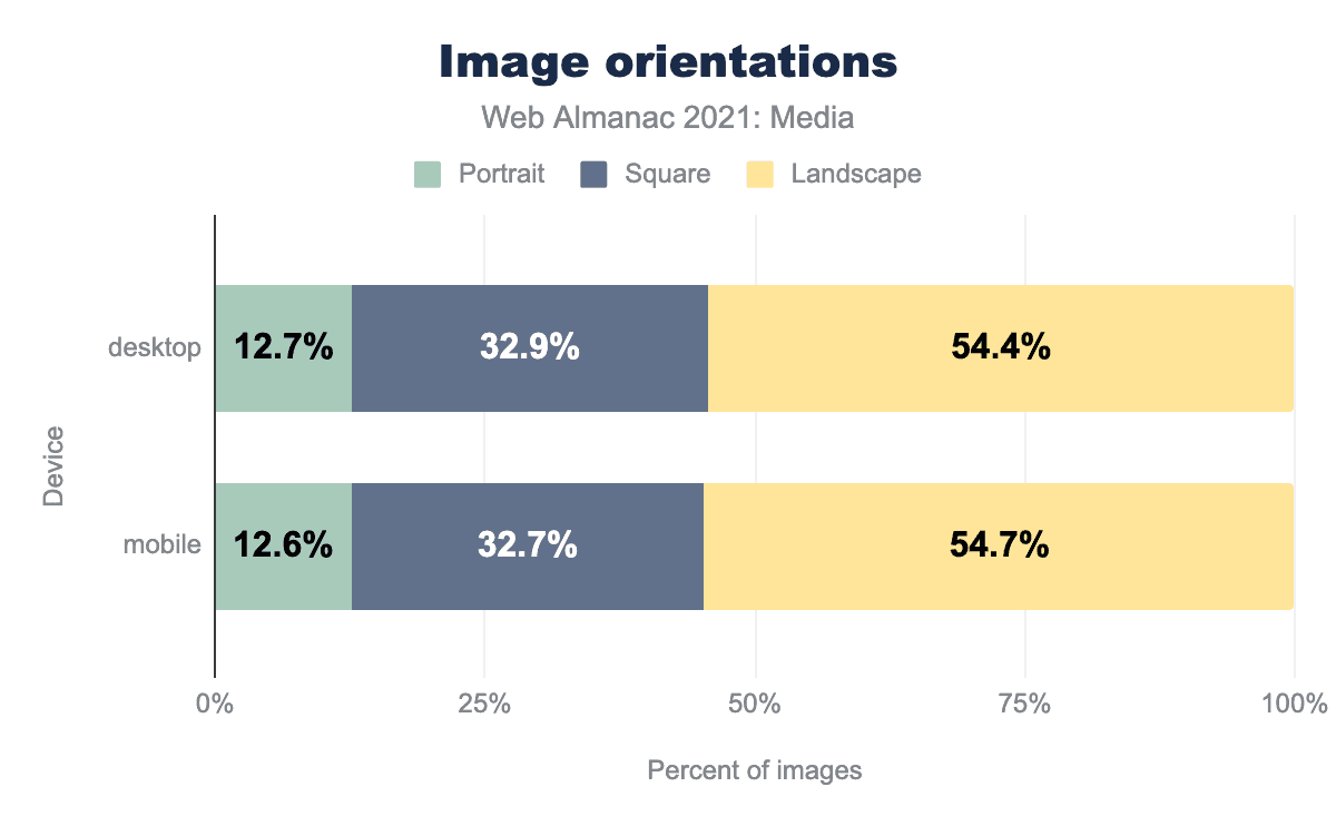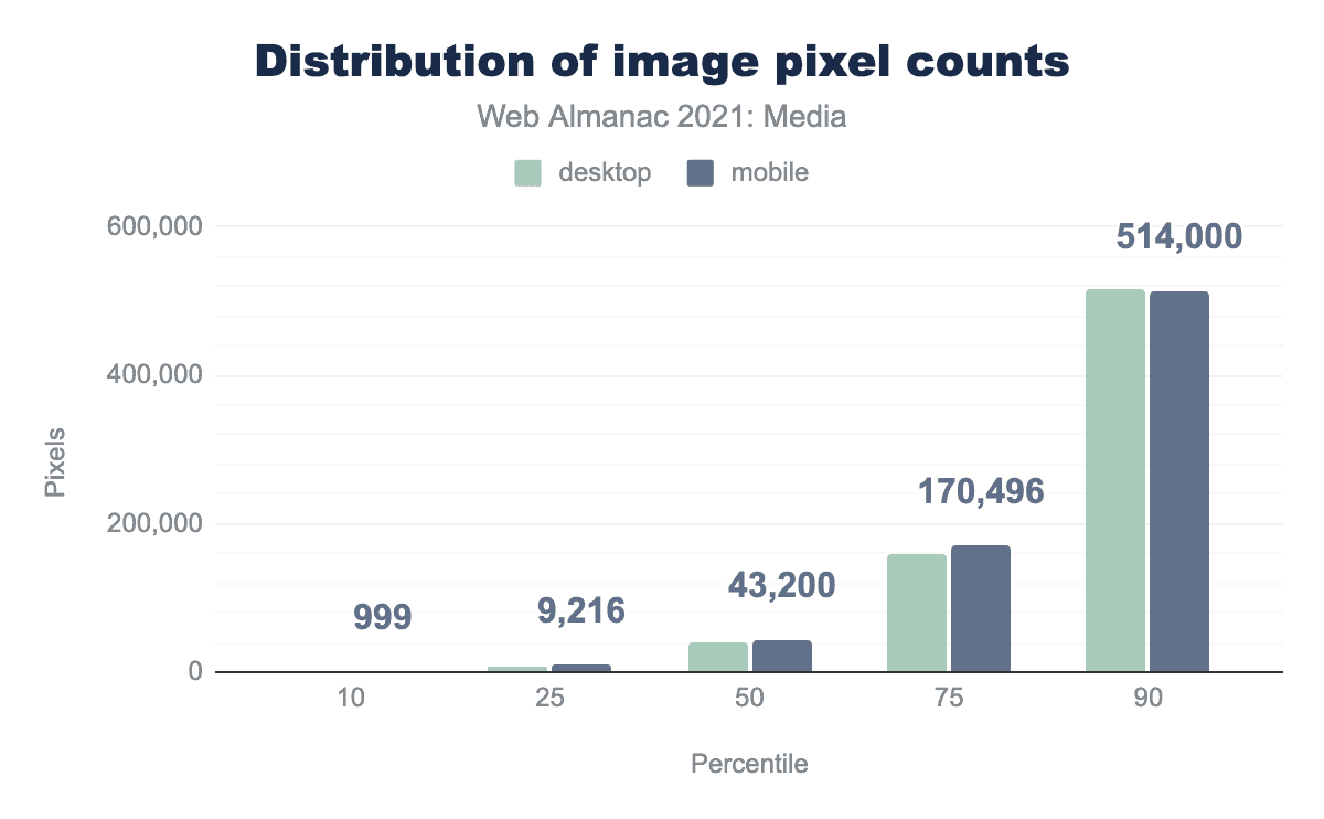また、画素数分布の上端では、デスクトップとモバイルの差がほとんどないことにも驚きました。当初、これはレスポンシブ画像機能が効果的に採用されていないことを示しているように思われましたが、モバイルクローラーのビューポートが360×512px @3x(つまり1,080×1,536物理ピクセル)であるのに対し、デスクトップのビューポートは1,376×768px @1xということを考えると、実は驚くべきことではありません。クローラーのビューポートが物理ピクセルで同幅である(1,080 vs 1,376)のです。クローラー間の物理的なピクセル解像度の差が大きければ、もっと明らかになるはずです。