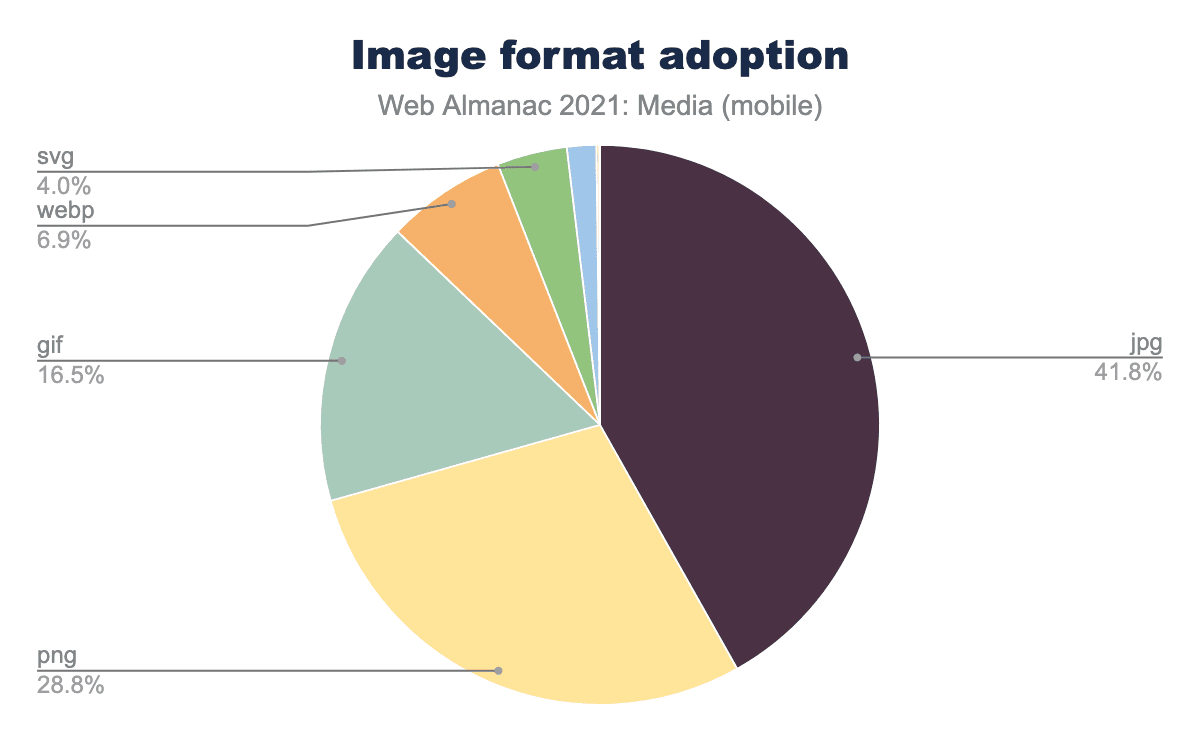 絶対に明らかなのは、WebPとAVIFの両方を使用すれば、Webのレガシー形式よりも効率的にさまざまなコンテンツ(写真、 イラスト、透明度の高い画像など)を配信できることです。しかし、次節で紹介するように、それほど多くのサイトが採用しているわけではありません。