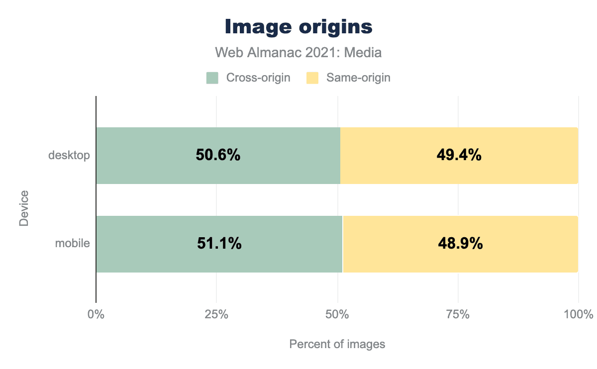 クロスオリジン画像は、重要なセキュリティ制限の対象となり、時にはパフォーマンスコストを発生することがあります。一方、静的資産を専用のCDNに移動することは、最初の1バイトまでの時間 を助けるためにできるもっともインパクトのあることの1つです。画像CDNは、あらゆる種類のベストプラクティスを自動化できる強力な変換および 最適化 機能を提供します。51%のクロスオリジン画像のうち、何枚が画像CDNでホストされているか、またそのパフォーマンスを他のウェブのものと比較することは、とても興味深いことでしょう。残念ながら、これは私たちの分析の範囲外でした。