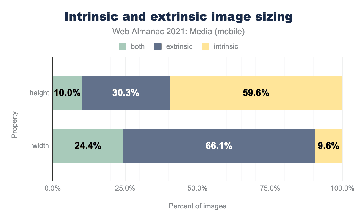 残念ながらheight と width は、ある次元では可変の外在サイズ(たとえば、 width: 100%;)が割り当てられ、他の次元では内在の縦横比を満たすように放置される画像とはうまく動作しません。これはレスポンシブデザインにおける支配的なパターンです。そのため、width と height はレスポンシブコンテキスト内で人気がなくなりましたが、2019年に ブラウザが height と width を使用する方法を調整 によってこの問題が修正されました。さて、一貫して height と width を設定することは、Cumulative Layout Shift を減らすために作成者ができる最善のことの1つです。これらの属性はどれくらいの頻度でこのタスクを達成しているのでしょうか?