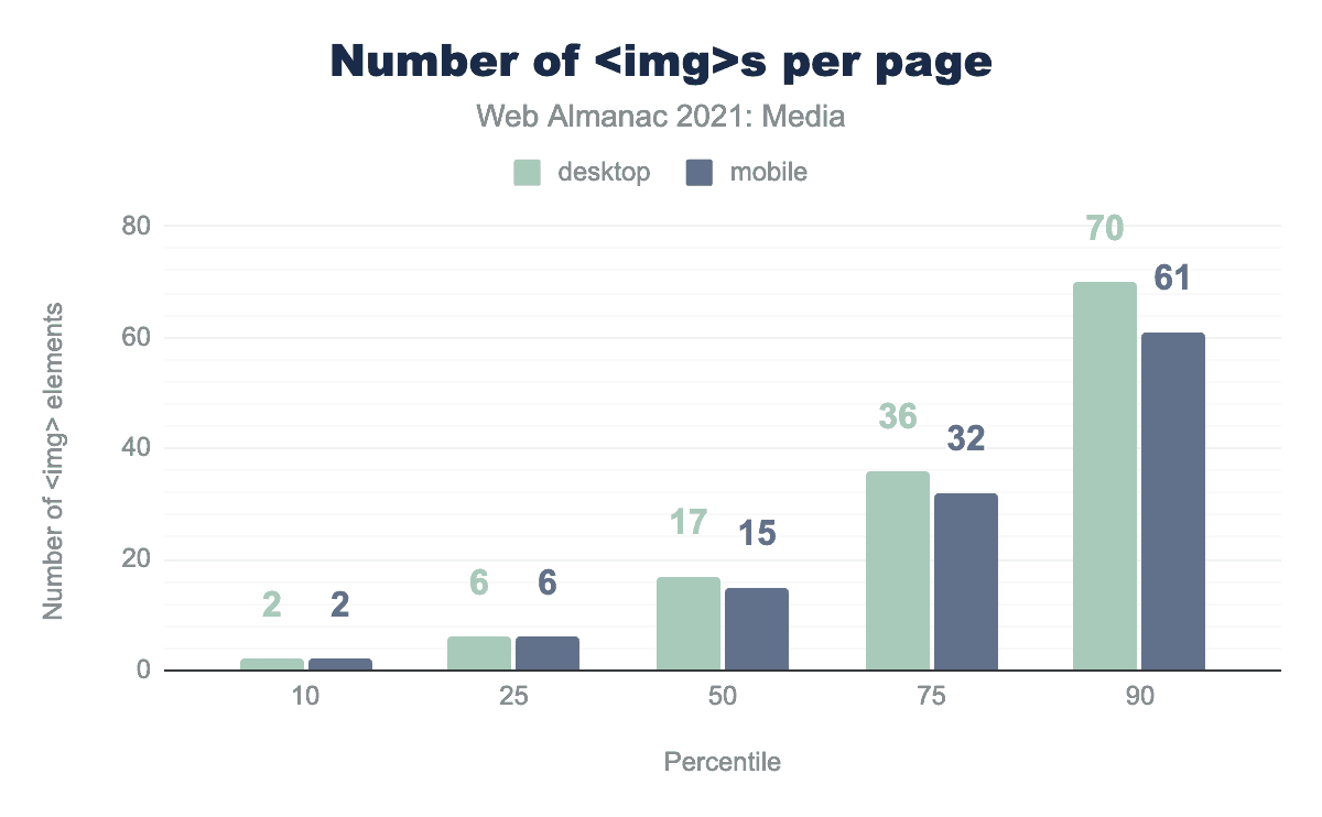 しかし、1ページあたりの<img>要素の数を考えると、この統計はそれほど驚くことでありません。ほとんどのページが15枚以上の画像を含んでいるため、多くの小さな画像やアイコンで構成されていることが多いのです。このように、ハーフメガピクセル以上の画像は、<img>要素の10個に1個しかないとはいえ、ページ間を移動する際には決して珍しいことではありません。多くのページには、少なくとも1枚の大きな画像が含まれます。