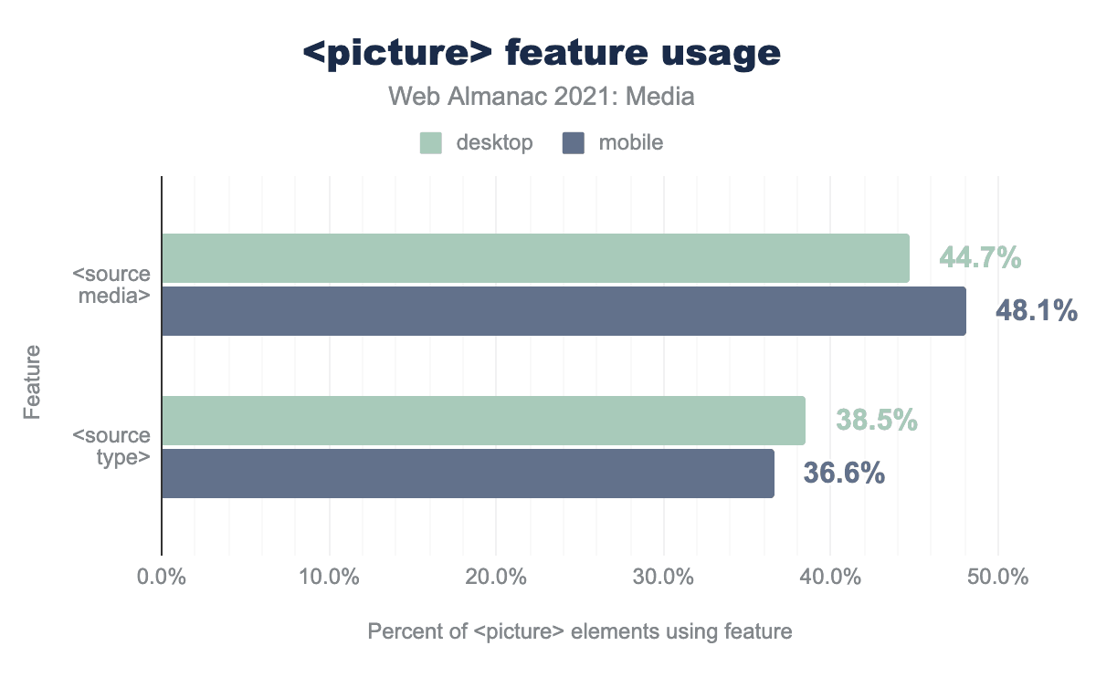 source 要素の media 属性と type 属性を、 picture 要素と組み合わせて使用しているページの割合を示す棒グラフです。media はモバイル48.1%、デスクトップ44.7%の picture 要素で使用されています。type はモバイルの picture 要素の37.6%、デスクトップの picture 要素の38.5%で使用されています。<picture> 機能の使用法。