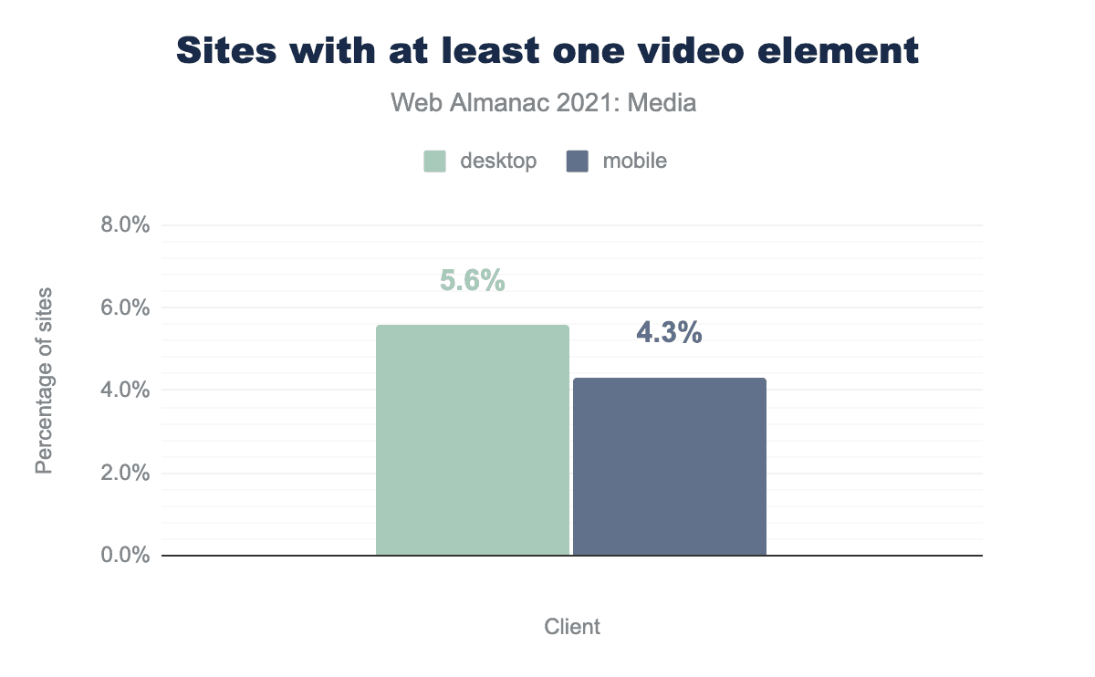 video要素の普及率を示す棒グラフです。デスクトップ5.6%、モバイル4.3%のサイトが、少なくとも1つの動画要素を備えています。このようにWeb上での動画利用が大きく伸びているのは、デバイス/ネットワークの向上に伴い、サイトに動画のような没入感を与えたいという要望があることを示しています。