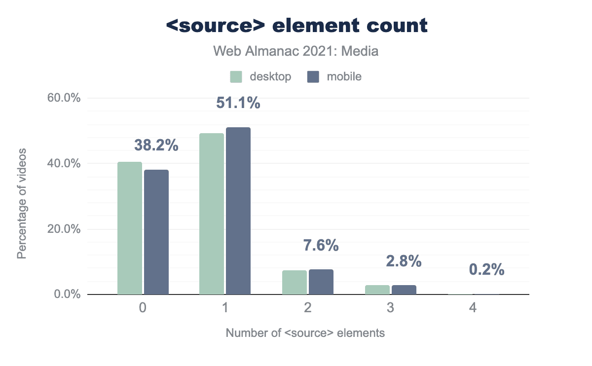 video 要素あたりのさまざまな数の source 要素の頻度を示す棒グラフです。もっとも一般的な video ごとの source 要素の数は1で、デスクトップの約49.2%とモバイルの51.1%の video がこの数のソースを含んでいます。2番目に多い source の子の数は0です。40.5%のデスクトップと38.2% のモバイルの video には source の子が存在しません。それぞれ7.2%と7.6%が2つの要素を含み、両方で2.8%が3つの要素を含み、最後にデスクトップとモバイルの両方で0.2%が4つの要素を含む video 要素を持ちます。source 要素の数。
