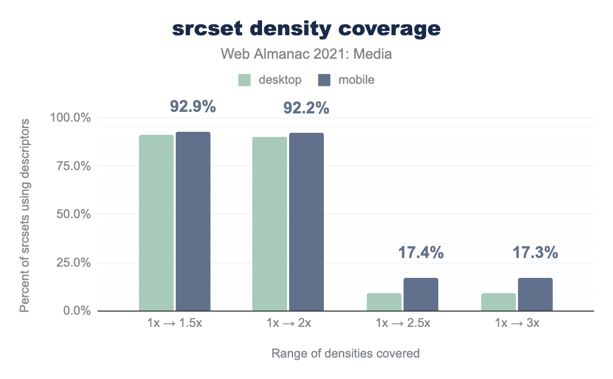 srcset属性内のx記述子とw記述子を使用しているページの割合を示す棒グラフです。x 記述子はデスクトップで6.1%、モバイルでは6.5%のページで使用されています。w 記述子は4倍使われている。デスクトップでは24.4%、モバイルでは24.3%の割合です。srcset 記述子の採用。