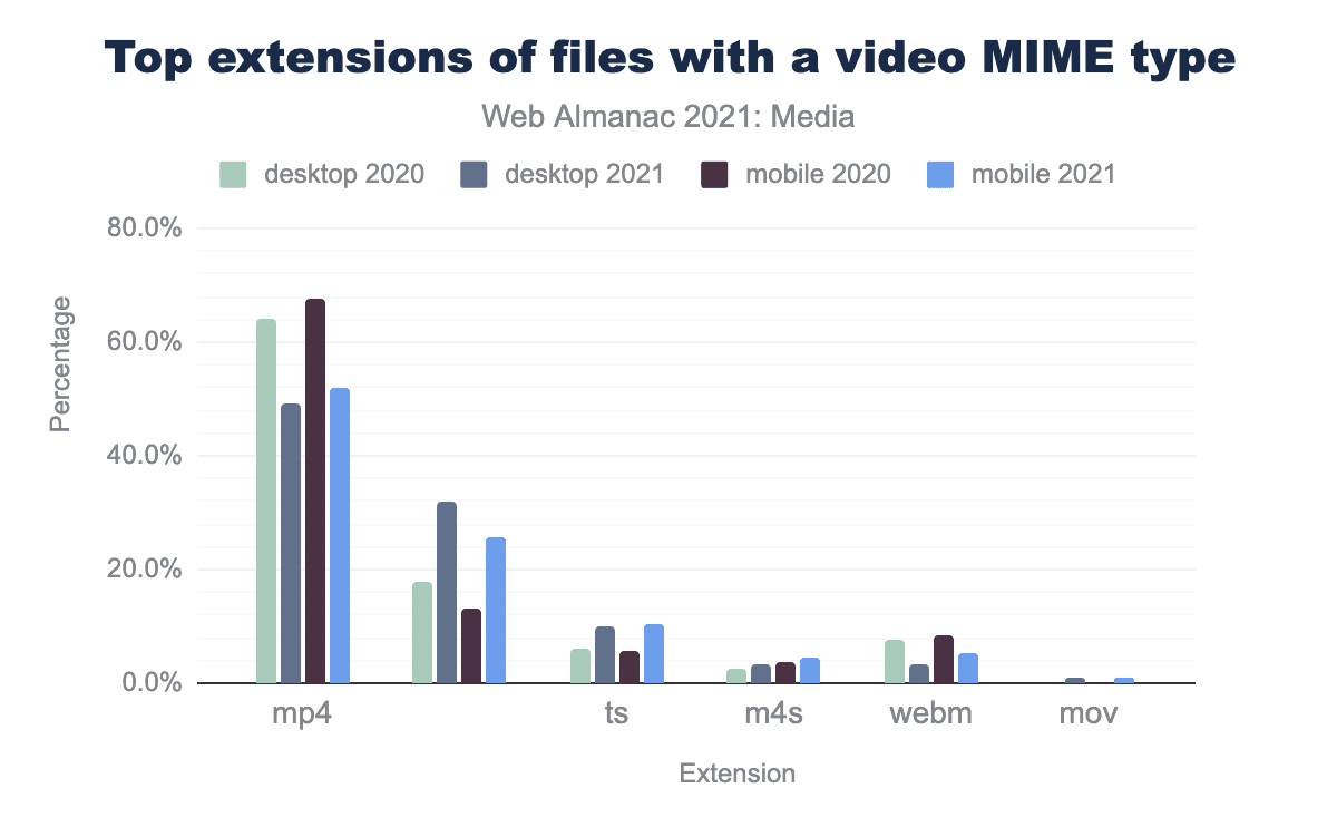 mp4拡張子の割合は、2020年には64.3%であったが、2021年には49.2%にとどまる。空白の拡張子は、2020年には動画の17.8%を占め、2021年には32.1%と急激に増加する。fvideosに占めるts拡張子の割合は、2020年には6.3%、2021年には10.0%となる。m4sは2.4%から3.3%に上昇した。webmは7.6%から3.3%に減少しました。最後、movは2020年のゼロから2021年には0.8%に成長した。Web上での動画フォーマットのナンバーワンは、圧倒的に mp4(またはMPEG-4)です。mp4 h264形式は、すべてのモダンブラウザで98.4% サポートされていて、 mp4 に対応していないブラウザの1.9% は動画をサポートしていないので、実質100%カバーというわけです。興味深いことに、mp4 の使用率はデスクトップとモバイルの両方で前年同期比 ~15% 減少しています。WebMのサポートも 前年同期比で大幅に減少(モバイルとデスクトップの両方で50%減少)しています。