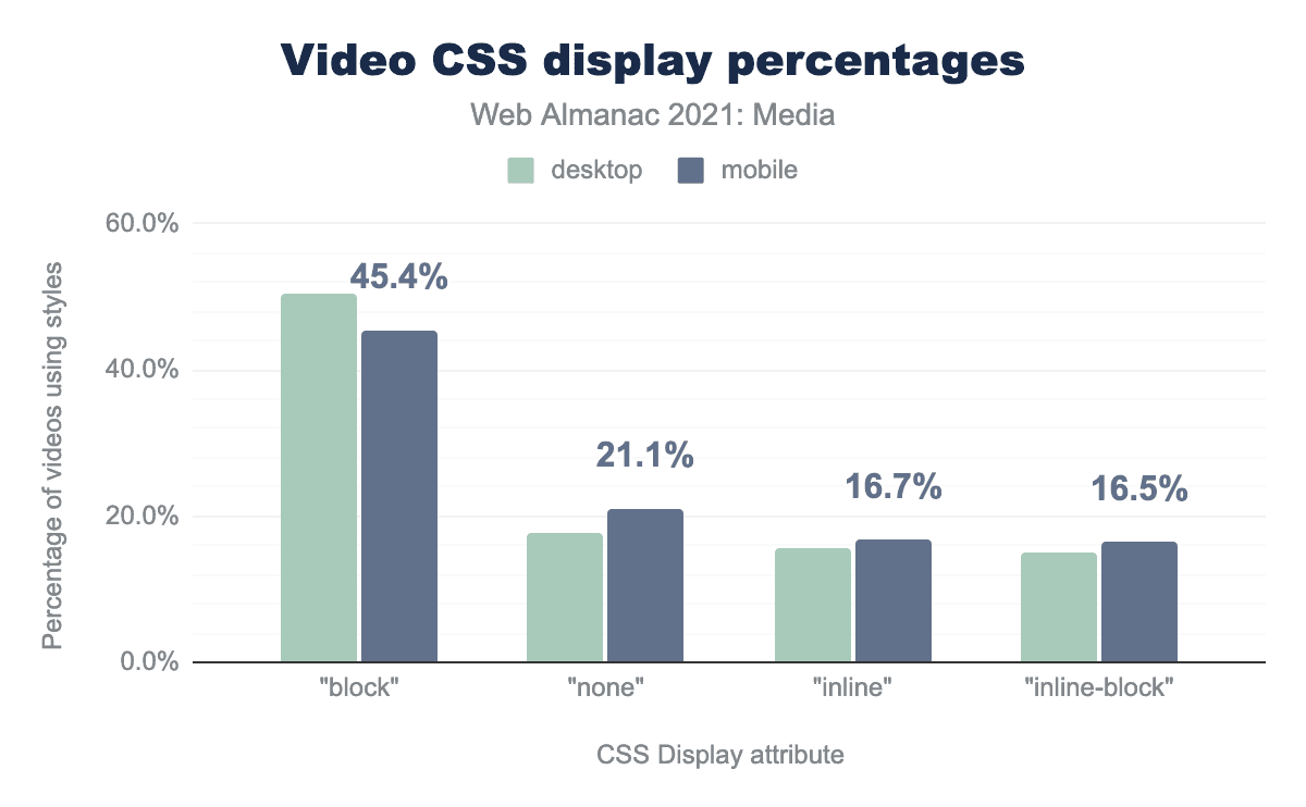 まず始めに、動画がページ上にどのように表示されるかを、その動画のCSS display プロパティで見てみましょう。その結果、約半数の動画がblockという表示値を使用しており、動画を独自の行に配置し、動画の高さと幅の値を設定できるようにしていることがわかりました。また、inline-blockの値では、高さと幅を指定することができ、すべての動画の合計で3分の2を指定できます。