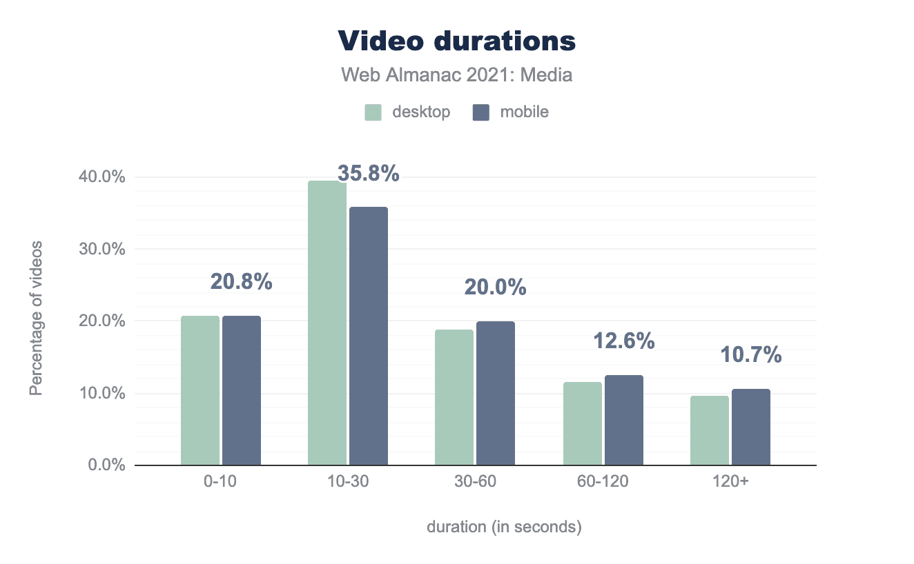 動画との相互作用については、ウェブページに掲載した場合の動画の長さが興味深いです。440k本のデスクトップ動画と382k本のモバイル動画についてこの値を照会することができ、継続時間をさまざまなバケット(秒単位)に分解することができました。