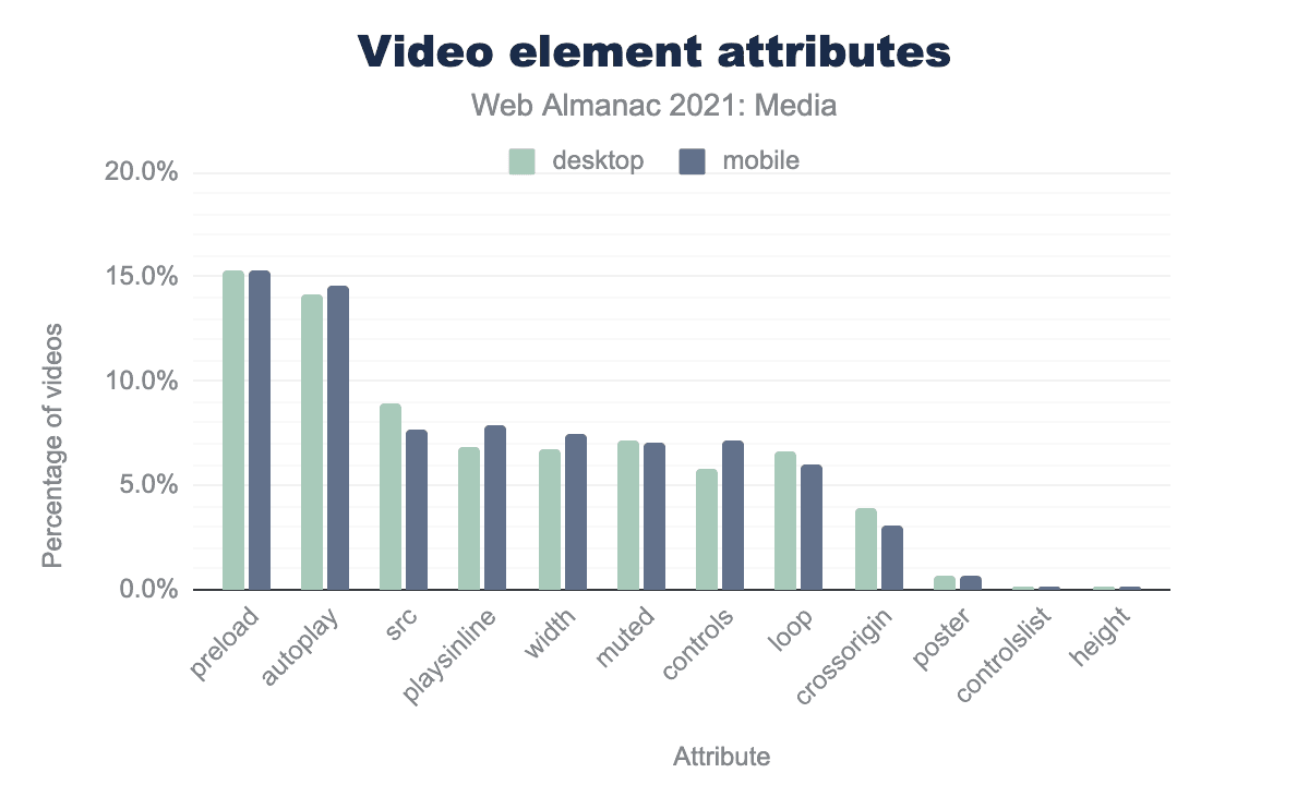 preloadはデスクトップで15.3%、モバイルでは15.3%、autoplay 14.1%、14.5%、src 8.9%、7.7%、playsinline 6.9%、7.8%、width 6.8%、7.5%、muted 7.1%、7.1%、 controls 5.8%、7.2%、 loop 6.6%、6.0%、 crossorigin 3.9%、3.0%、 poster 0.7%、0.7%、 controlslist 0.2%、0.2%、最後に height 0.1%、0.1%となります。