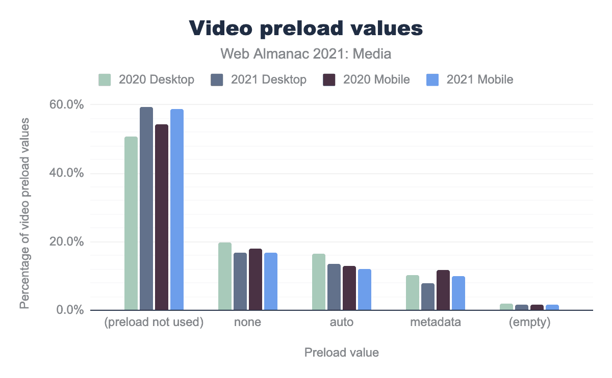 noneが使われ、2021年には18.1%に減少、モバイルでは16.8%から16.7%と減少幅が小さくなっています。デスクトップでは16.6%の動画にautoという値が使用されていましたが、2021年には12.9%に低下し、モバイルでは13.7%から12.0%に低下しています。metadataは、デスクトップでは2020年に10.1%、2021年には11.8%に、モバイルでは8.0%から10.1%に増加しました。2020年のデスクトップ動画の1.8%、2021年のデスクトップ動画の1.7%、2020年のモバイル動画の1.5%、2021年のモバイル動画の1.6%は値が設定されていない。興味深いことに、モバイルとデスクトップの両方でpreloadが大幅に削減されていることがわかります。多くの動画で変更された可能性がありますが、昨年ウェブに追加された新しい動画がこの設定を利用していないだけかもしれません。ページ重量の観点からは、これはウェブにとって大きな勝利です。