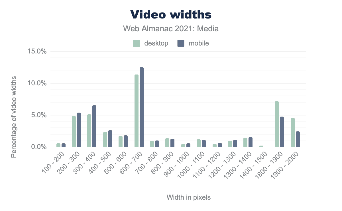 width の分布を示す棒グラフです。デスクトップとモバイルの値は、最後まで、ほとんどの範囲において非常に似ています。左から順に、100〜200ピクセルの値がデスクトップで0.6%、モバイルでは0.5%、200〜300がそれぞれ4.9%、5.4%、300〜400 5.1%、6.6%、400〜500 2.4%、2.6%、500〜600 1.8%、1.8%、600〜700 11.4%、12.6%、700〜800 0.9%、1.0%、800~900は1.4%と1.3%、900~1000は0.5%と0.6%、1000~1100は1.2%と1.1%、 1100~1200は0.5%と0.7%、1200~1300は0.9%と1.1%、1300~1400は1.5%と1.6%、1400~1500はモバイルではなくデスクトップの0.2%、1800~1900 7.2%、4.8%、1900~2000 4.6%、2.4%です。動画の幅も定義している大きな動画を持つサイトの約半数が、モバイルデバイス用に大きな動画を削除しているようです。ウェブサイトに埋め込まれた1080p(1920ワイド)のビデオを必要とするデバイスはほとんどないため、これは理にかなっていると言えるでしょう。