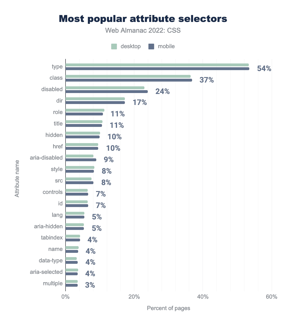 typeで54%、次にclassで37%、disabled 24%、dir 17%、roleとtitle 11%、hidden,href 10%、aria-disabled 9%、 style,src 8%、 controls,idで7%、 langとaria-hiddenで5%、そしてtabindex、name、data-type、aria-selectedで4%、最後にmultipleで3%が挙げられています。もっとも普及している属性セレクターは type で、54%のページで利用されています。次にもっとも普及している属性セレクターは class で37%、 disabled で25%、そして dir で17%のページで利用されています。