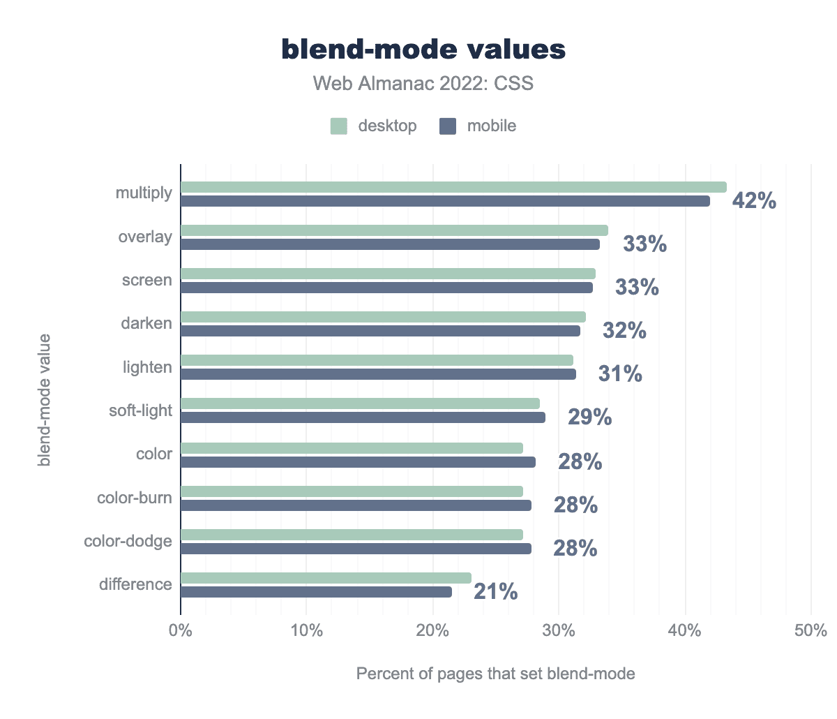 overlayとscreen、32%でdarken、31%でlighten、29%でsoft-light、28%でcolor、28%でcolor-burnとcolor-dodge、最後に21%でdifferenceとなっています。ブレンドモードでもっともよく見られる値はmultiplyで、42%のページで見られました。しかし、他の値についても、かなりの割合で分布しています。