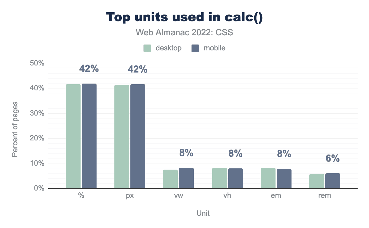 計算にピクセルを使用しているサイトの割合は9ポイント減少し、現在では%の使用率と同じ42%になっています。ビューポートの単位である vw と vh は今年2%から8%に、 em は同じだけ増加し、 rem の使用率は3%から6%に倍増しています。
