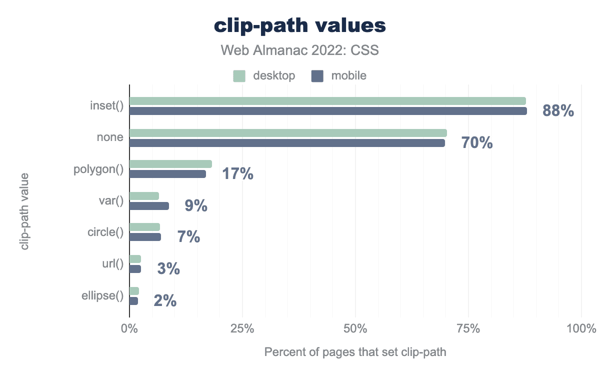 clip-path を使って要素をクリップしているページでは、大多数が inset() という、単純に要素のボックスを挿入する値を使っており、clip-path を使っているページの88% がこの関数を使っているとのことです。