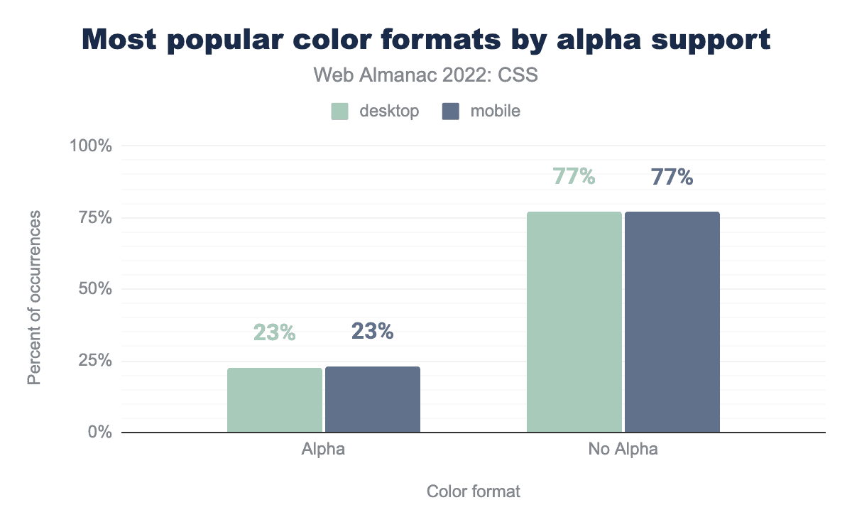 #RRGGBB構文が49%のページ、3桁の#RGBが25%のページ、rgba関数が14%のページ、透明キーワードが8%のページ、名前付きカラーが2%、rgb関数は1%、残りのフォーマットは1%未満のページで使用されており、以下の通りであった。8桁の#RRGGBBAA、hsla関数、currentColorキーワード、4桁の#RGBA、システムカラーキーワード、hsl関数、カラー関数、hwb関数、lch関数、そして最後にlab関数が、人気順に並んでいます。伝統的な6桁の #RRGGBB 構文の使用は2021年以来変わっておらず、色の宣言の半分で使用されています。8桁の #RRGGBBAA 16進法が広く使われているにもかかわらず、rgba() 形式がアルファ成分を追加する方法としてもっとも広く使われているのは、おそらくこれがずっと以前にブラウザへ実装されたからでしょう。