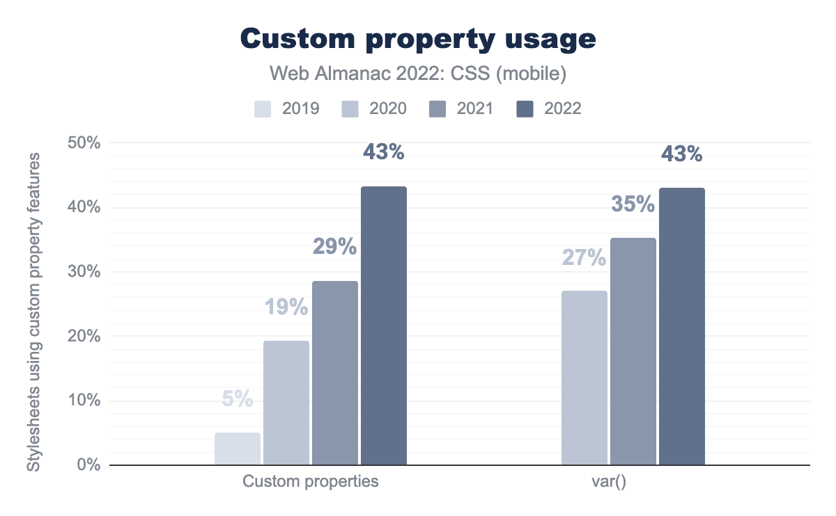 var()関数は、2020年に27%、2021年に35%、そして2022年の現在は43%のページで使用されています。カスタムプロパティ(CSS変数として知られることもある)の使用は大きく急増し、2021年から2022年にかけての成長も例外ではありません。デスクトップとモバイルの両方で、43%のページがカスタムプロパティを使用しており、少なくとも1つの var() 関数を持っています。