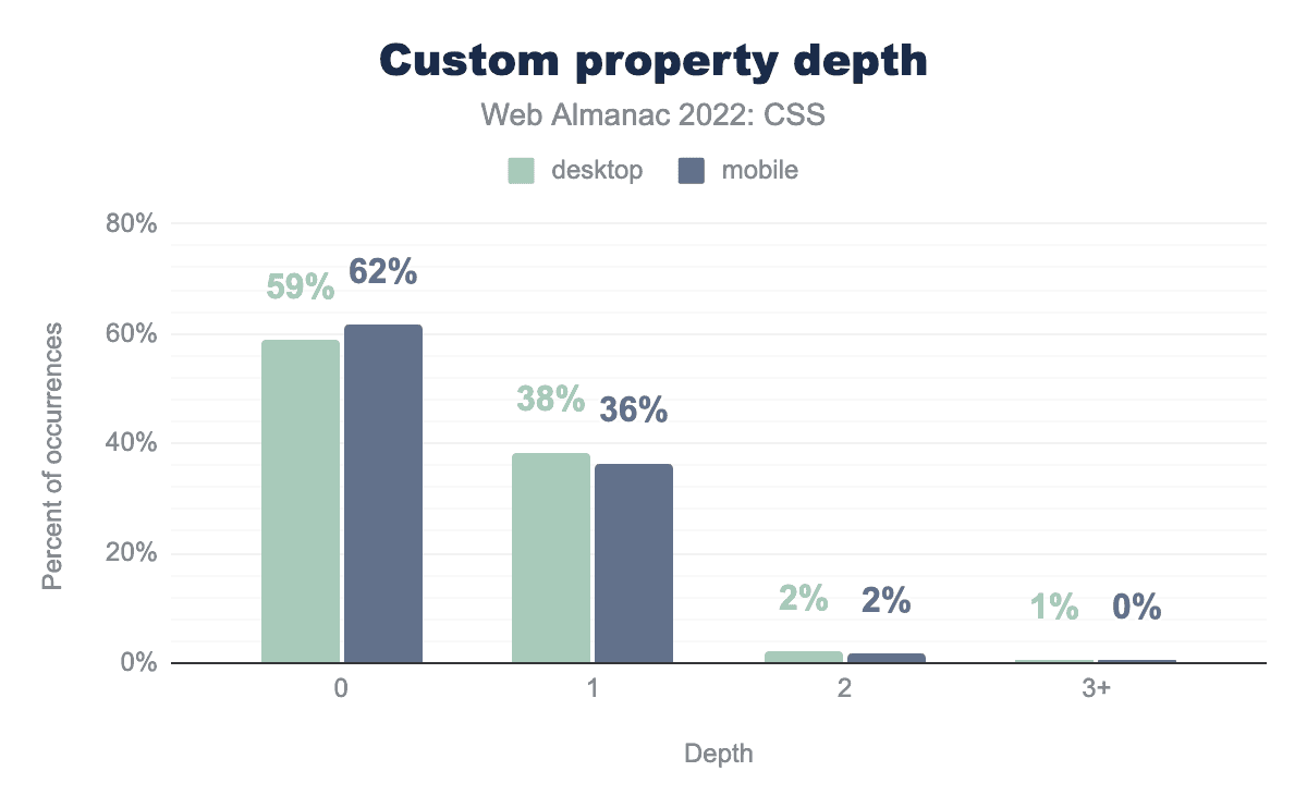 2021年に見られるように、大半のカスタムプロパティは深さが0であり、他のカスタムプロパティの値をその値に含めないことを意味する。深度1のプロパティの数は少し増え、深度2の数は少し減りました。しかし、このデータからは、過去1年間にカスタムプロパティの使い方がそれほど複雑になったとは思えません。