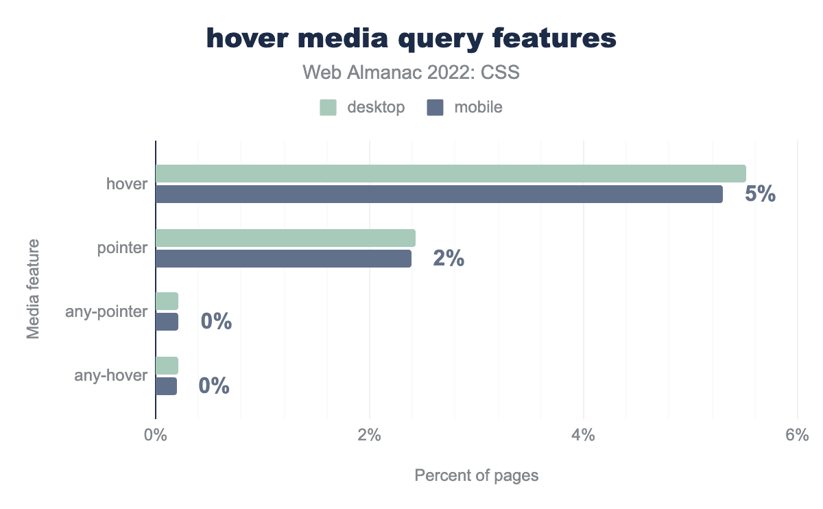 hover と pointer の両方がもっとも多い機能のトップ10に入っています。あまり役に立たない any-pointer と any-hover はほとんど使われていないようです。any-pointer を使用すると、 pointer が現在タッチスクリーンを使用していることを示していても、ユーザーがマウスやトラックパッドなどの細かいポインターにアクセスしているかどうかを判断できます。これらの機能を組み合わせることで、ユーザーがどのような環境で作業しているかを把握できます。