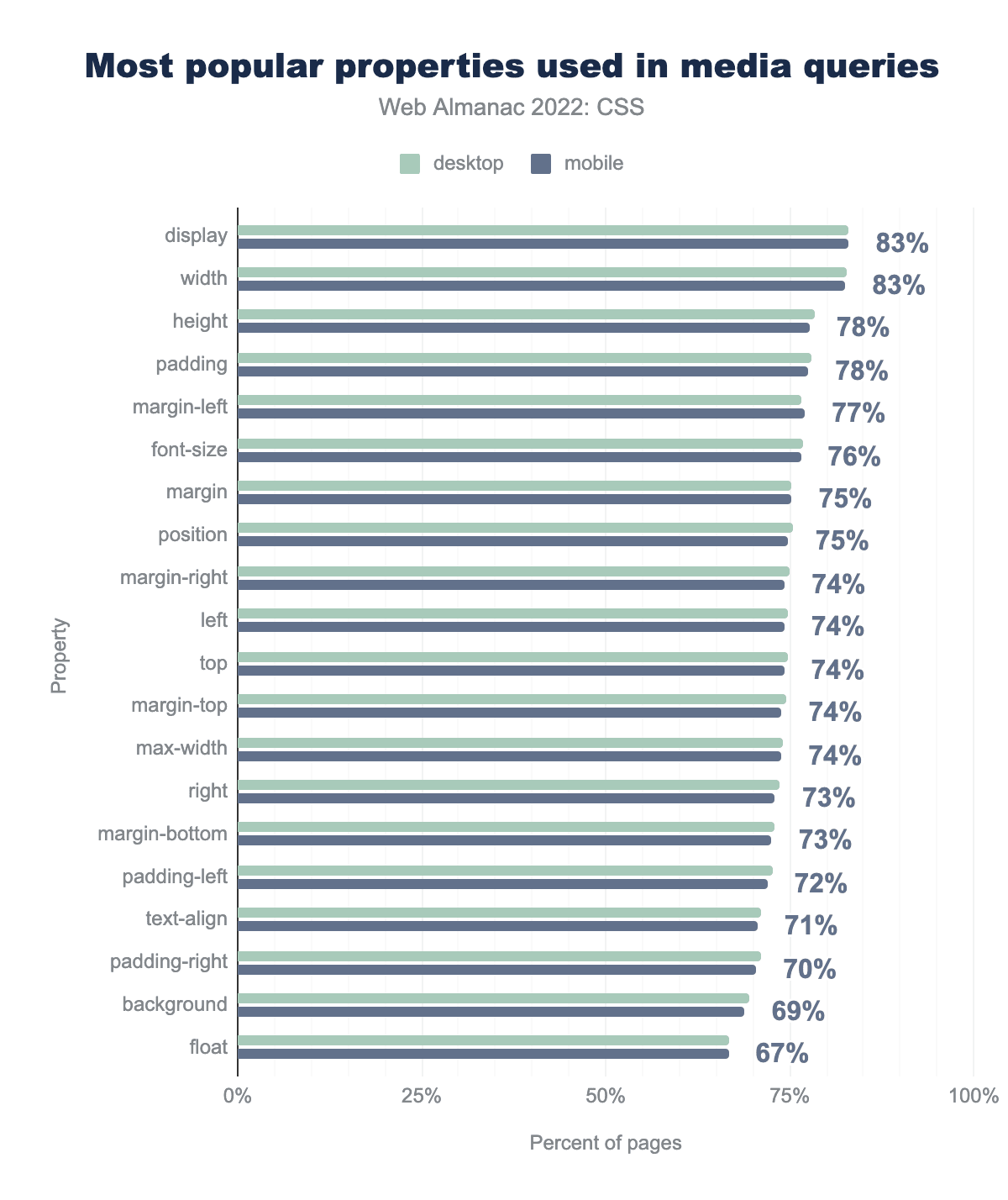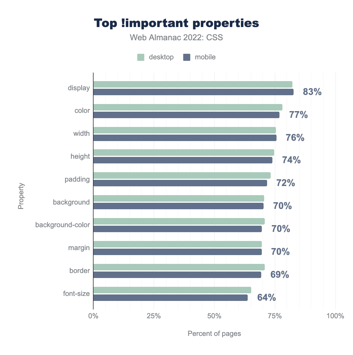 !importantで使用されるプロパティのうち、もっとも普及しているものを棒グラフで示した。モバイルページでは、displayが83%、color 77%、width 76%、height 74%、padding 72%、background、background-color、marginがそれぞれ70%、border 69%、そして最後にfont-sizeが64%という値になっています。!importantが適用される上位のプロパティを示します。