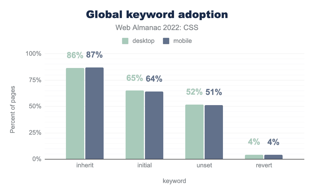 inheritが87%、initial 64%、unset 51%、revert 4%で続いています。昨年はグローバルキーワードの使用率が大幅に上昇しましたが、2022年はinheritが同じ割合で使用されています。しかし、他の3つの数値は使用率が上昇しています。新しい値では、revertが1%から4%に増加しました。