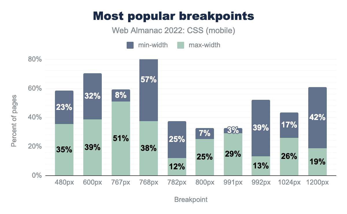max-width に480pxを、23%がmin-width に使用しています。39%のページがmax-width に600pxを、32%がmin-width に600pxを使用しています。51%のページがmax-width に767px、min-width に8%を使用。38%のページがmax-width に768px、min-width に57pxを使用しています。12%のページがmax-width に782pxを、min-width に25%を使用しています。25%のページがmax-width に800pxを、min-width に7%を使用。29%のページがmax-width に991pxを、min-width に3%を使用しています。13%のページがmax-width に992pxを、min-width に39%を使用しています。26%のページがmax-width に1024pxを、17%がmin-width に1024pxを使用。19%のページがmax-width に1200px、min-width に42%を使用しています。過去2年間と同様、共通のブレイクポイントはほとんど変化していません。グラフは同じ形をしており、もっとも一般的なブレークポイントは、max-widthが767px、min-widthが768pxとなっています。2021年に述べたように、これはポートレートモードのiPadに対応します。