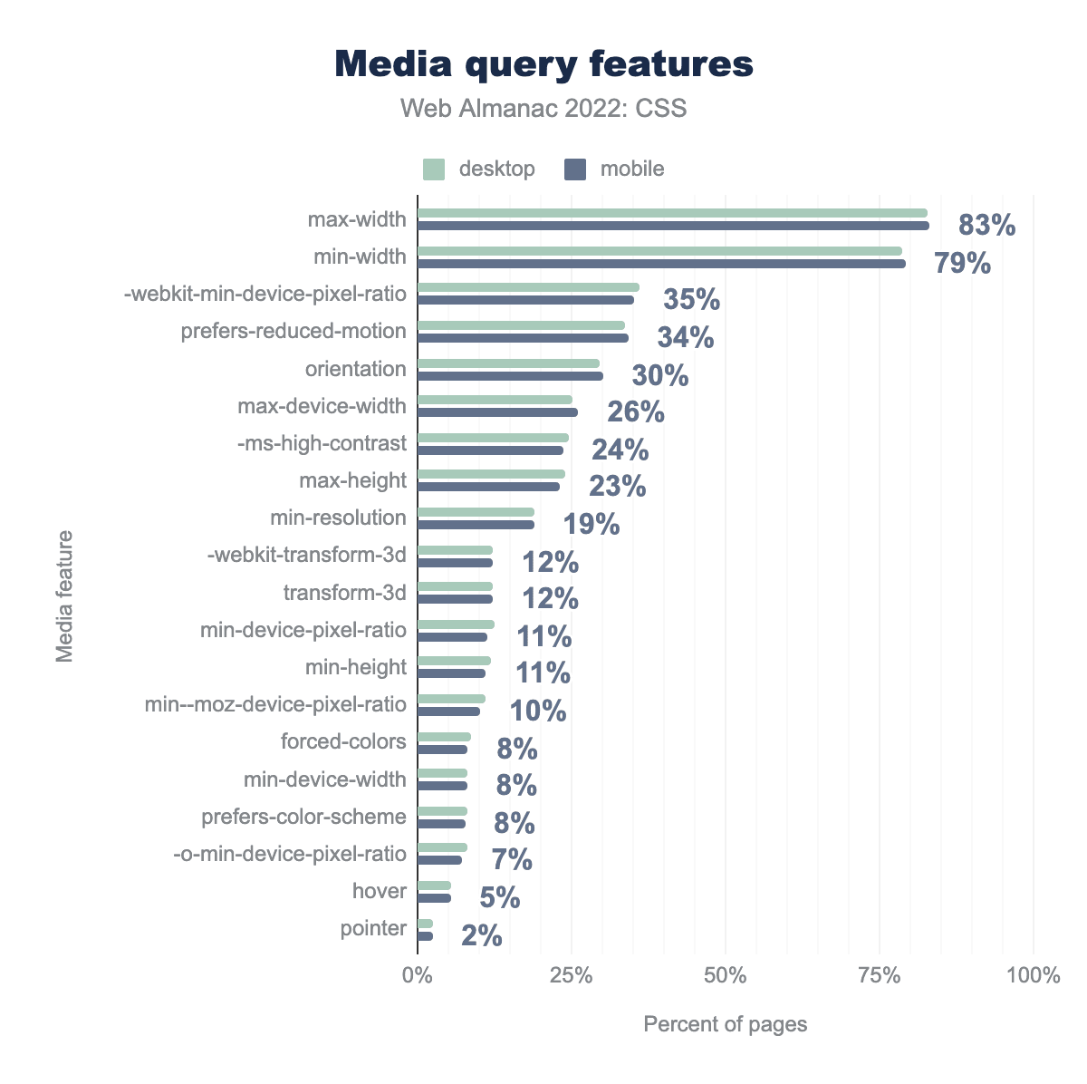 max-width、次いでmin-width 79%、-webkit-min-device-pixel-ratio 35%、 prefers-reduced-motion 34%、 orientation 30%、 max-device-width 26%、 -ms-high-contrast 24%、 max-height 23%、 min-resolution 19% となっています。-webkit-transform-3dおよびtransform-3d 12%, min-device-pixel-ratioおよびmin-height 11%、min--moz-device-pixel-ratioは10%、forced-colors、min-device-widthとprefers-color-schemeが8%、-o-min-device-pixel-ratio 7%、hover 5%、pointer 2%です。しかし、2021年にランキング上昇を指摘されたprefers-reduced-motionメディアクエリは、今回orientationを抑えて4位を獲得しました。これは、prefers-reduced-motionが2%上昇した一方で、orientationが4%下落したためです。
