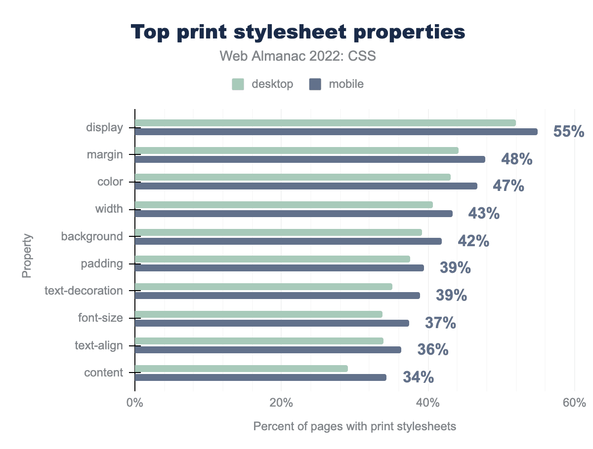 displayプロパティは印刷スタイルシートを持つページの55%で使われ、margin 48%、color 47%、width 43%、background 42%、paddingとtext-decoration 39%、 font-size 37%、 text-align 36%、content 34%がそれに続く。印刷用スタイルを使用しているページのうち、半数以上がdisplayの値を変更しています。おそらく、印刷用にグリッドやフレックスのレイアウトを簡素化するためでしょう。また、色を変えたり、マージンやパディングを調整したり、font-sizeを設定している人も見受けられます。34%は content プロパティで、これは生成されたコンテンツを挿入するために使用されます。