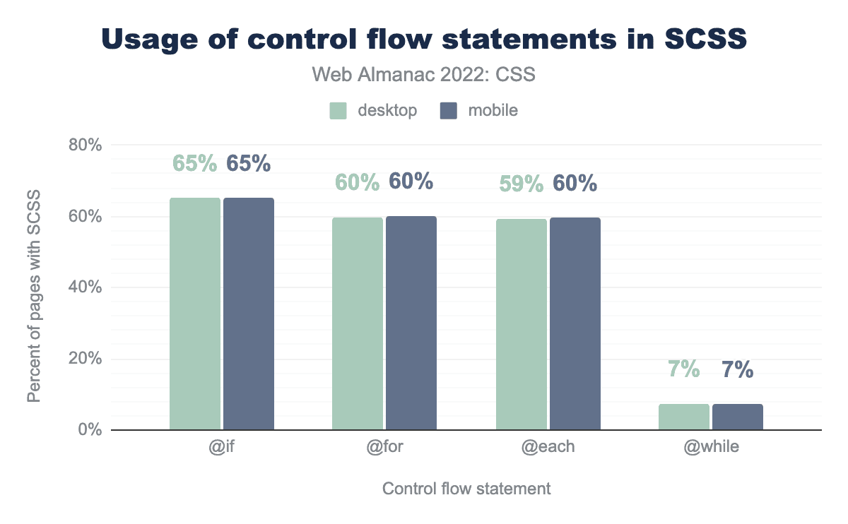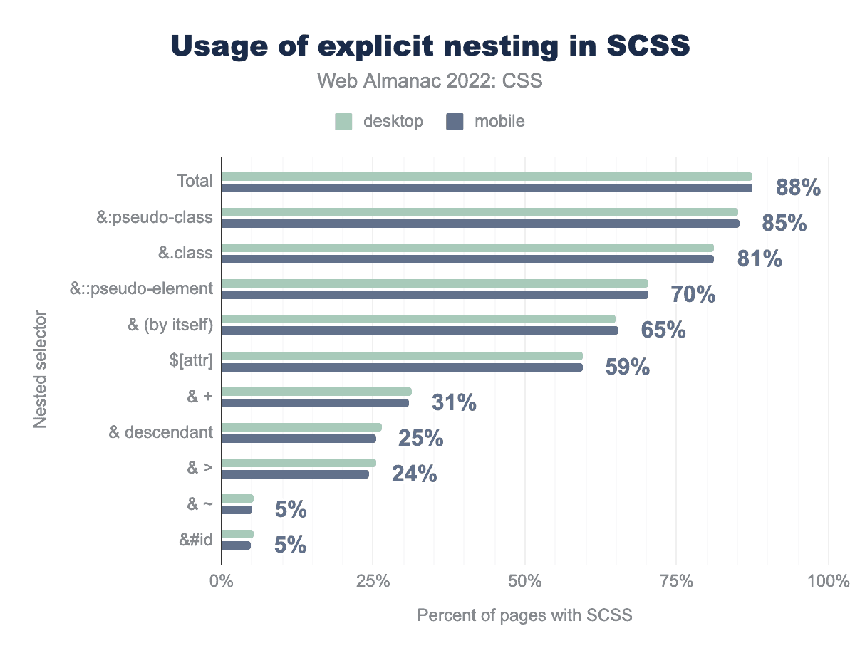 &:pseudo-class、次いで&.class 81%、&::擬似要素70%、そのまま & 単体65%、&[attr]59%、& +(隣接兄弟)31%、&子孫25%、& >(子)24%、& ~と &#id 5%の順になっています。ネスティングはまた、CSSネスティングの将来の仕様が現在CSSワーキンググループで開発・議論されていることを考えると、興味深いものです。SCSSシートのネスティングは非常に一般的で、&という文字を探すことで識別できます。昨年と同様に、:hoverのような擬似クラスや、.activeのようなクラスがもっともよくネストされるケースを構成しています。すべての用途で微増しているが、&子孫は18%から25%へと7ポイント増加している。暗黙の入れ子は特殊文字を使用しないため、本調査では測定していない。