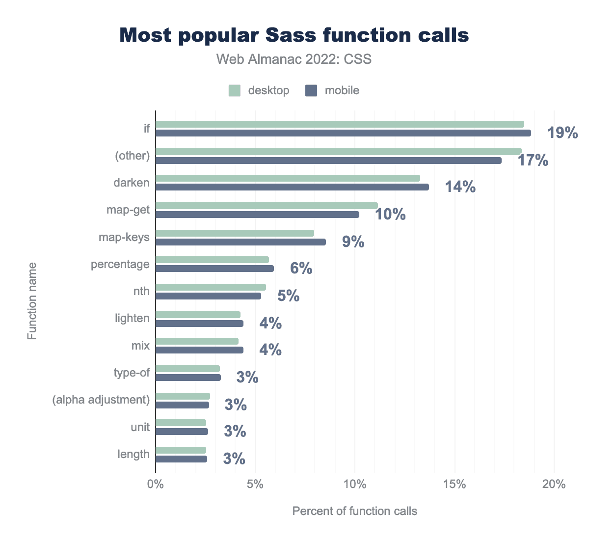 if関数が19%を占め、以下、その他の関数17%、darken 14%、map-get 10%、map-keys 9%、パーセンテージ6%、nth 5%、lightenとmix 4%、type-of、α調整、単位、長さが3%と続きます。関数の呼び出しを見ると、色関数はまだSassの非常に一般的な使い方であり、近いうちに color-mix() などの 新しいCSS色関数に置き換えられるかもしれないことがわかります。昨年からの変化もある。darken機能が2ポイント下がって14%で3位となった。しかし、lighten機能は1ポイント増えている。