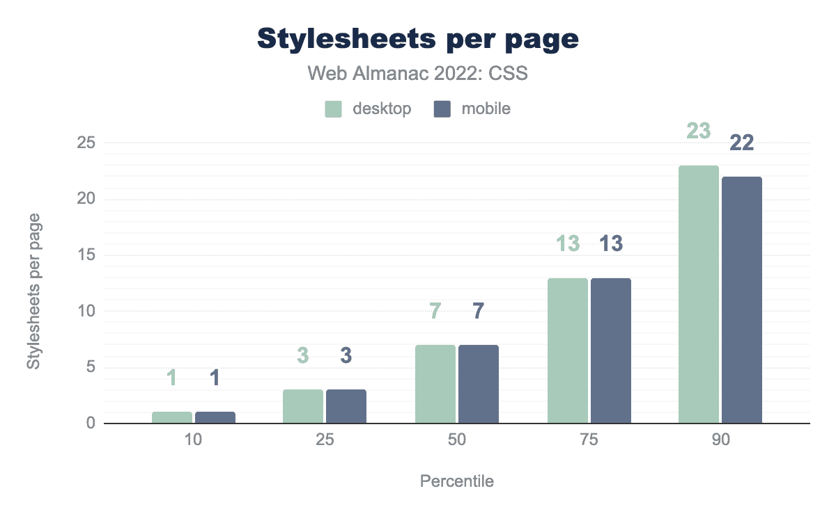 ページあたりのスタイルシート数は2021年とほぼ同じで、50パーセンタイル台でモバイルが1つ増えています。